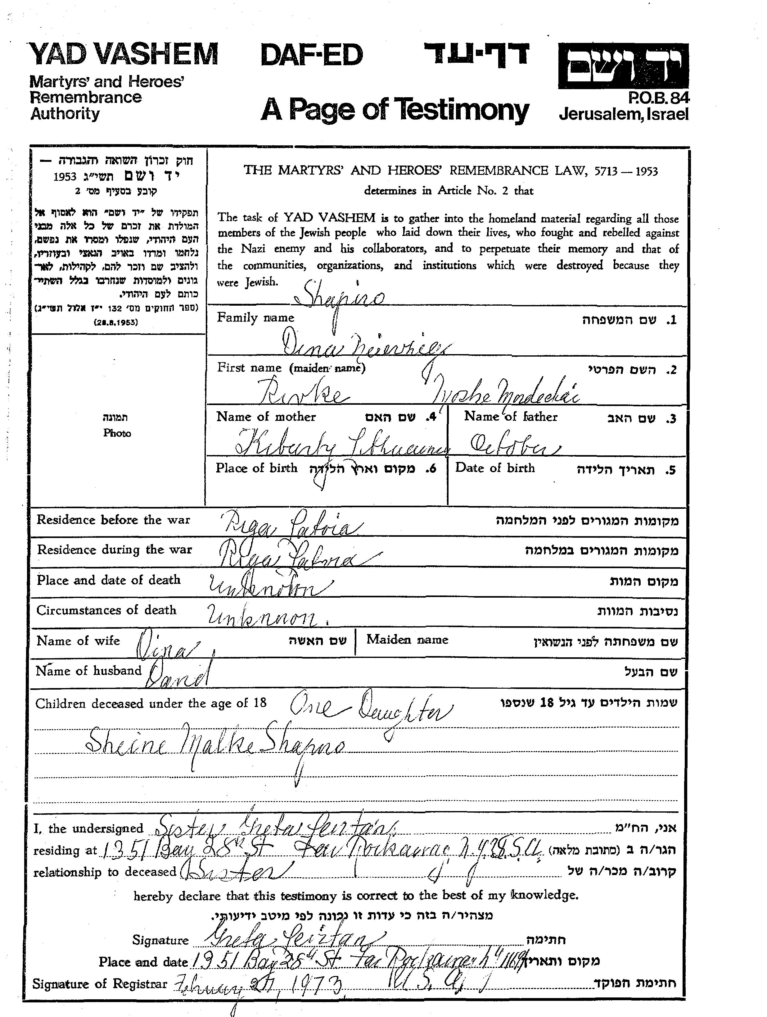 Шапиро Дина Ривке Рига, Латвия Лист свидетельских показаний