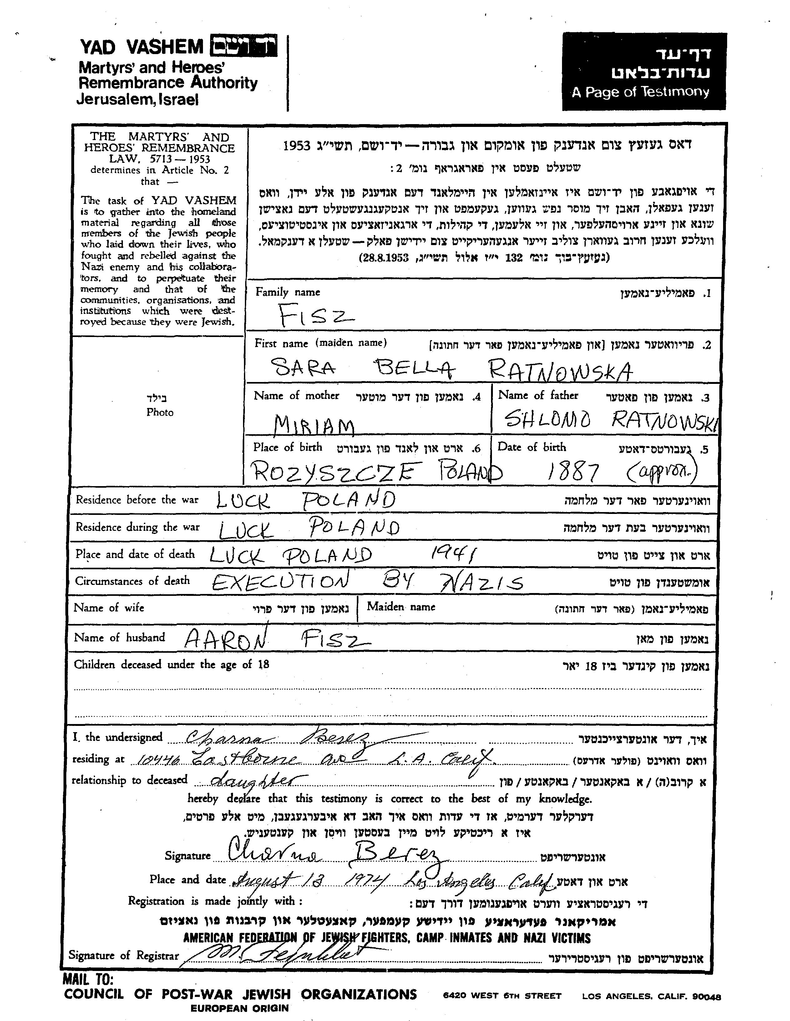 Сара Белла Фиш, девичья фамилия Ратновски, место рождения: Рожище, Польша. Отец: Шломо, mать:Мирьям. Место жительства до войны: Луцк, Польша. Место во время войны: Луцк, Польша.