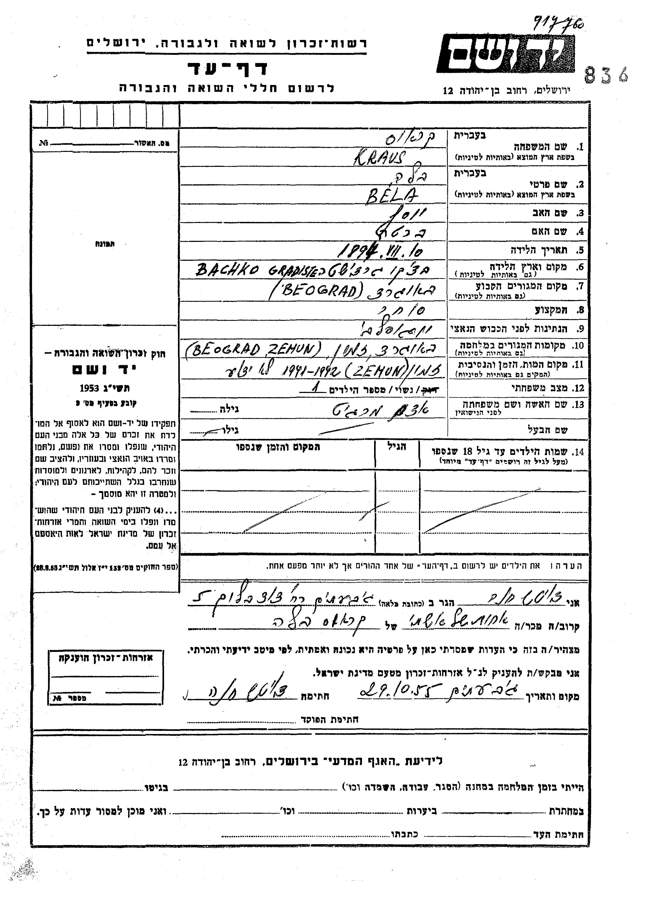 Бела Краус, место рождения: Бачко-Градиште, Югославия. Отец: Иосеф, mать:Берта. Торговец / торговка. Женат / замужем. Место жительства до войны: Белград, Югославия. Место во время войны: Земун, Югославия.