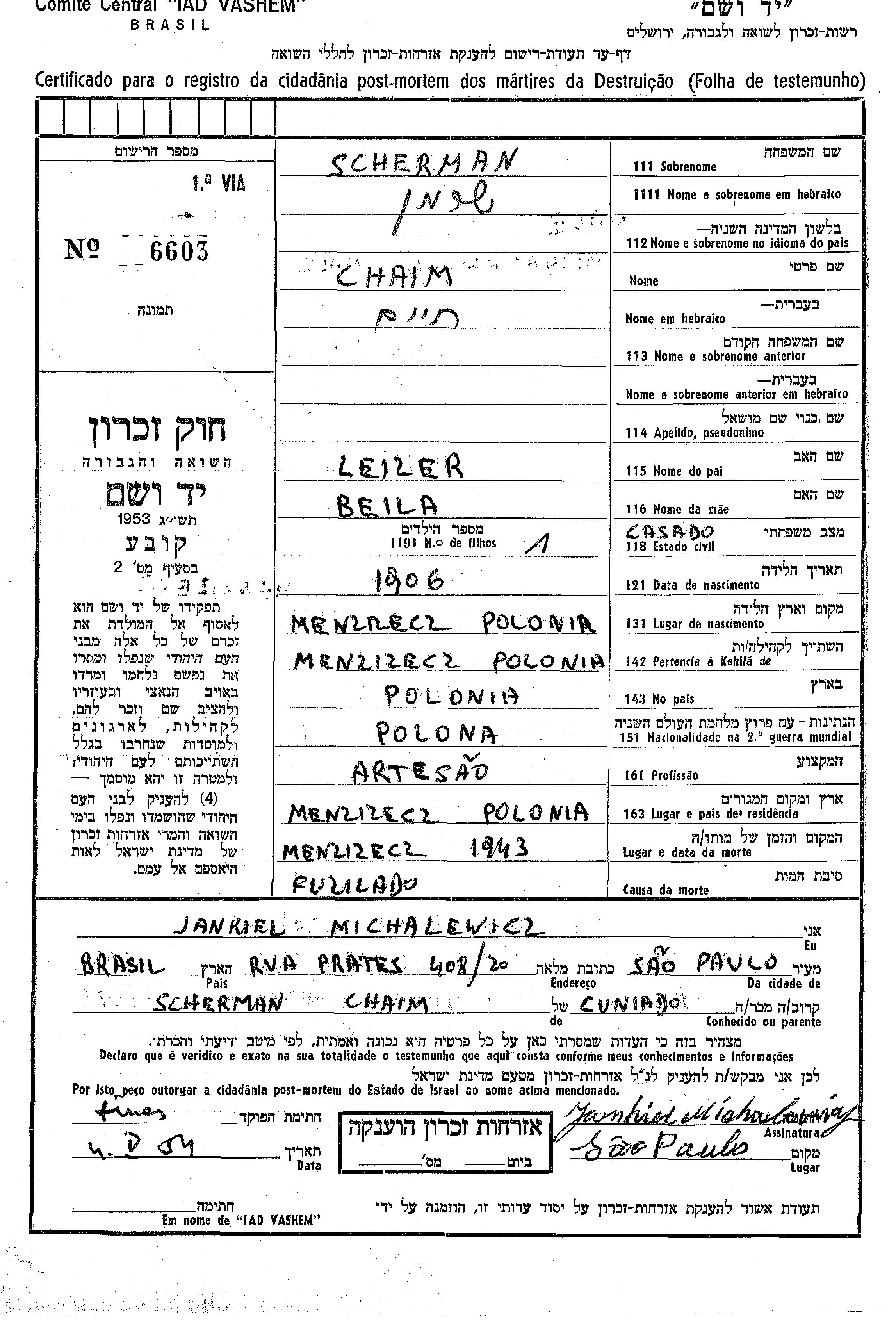 Хаим Шерман, место рождения: Мендзыжеч, Польша. Отец: Лейзер, mать:Бейла. Artesao. Женат / замужем. Место жительства до войны: Мендзыжеч, Польша. Место во время войны: Мендзыжеч, Польша.