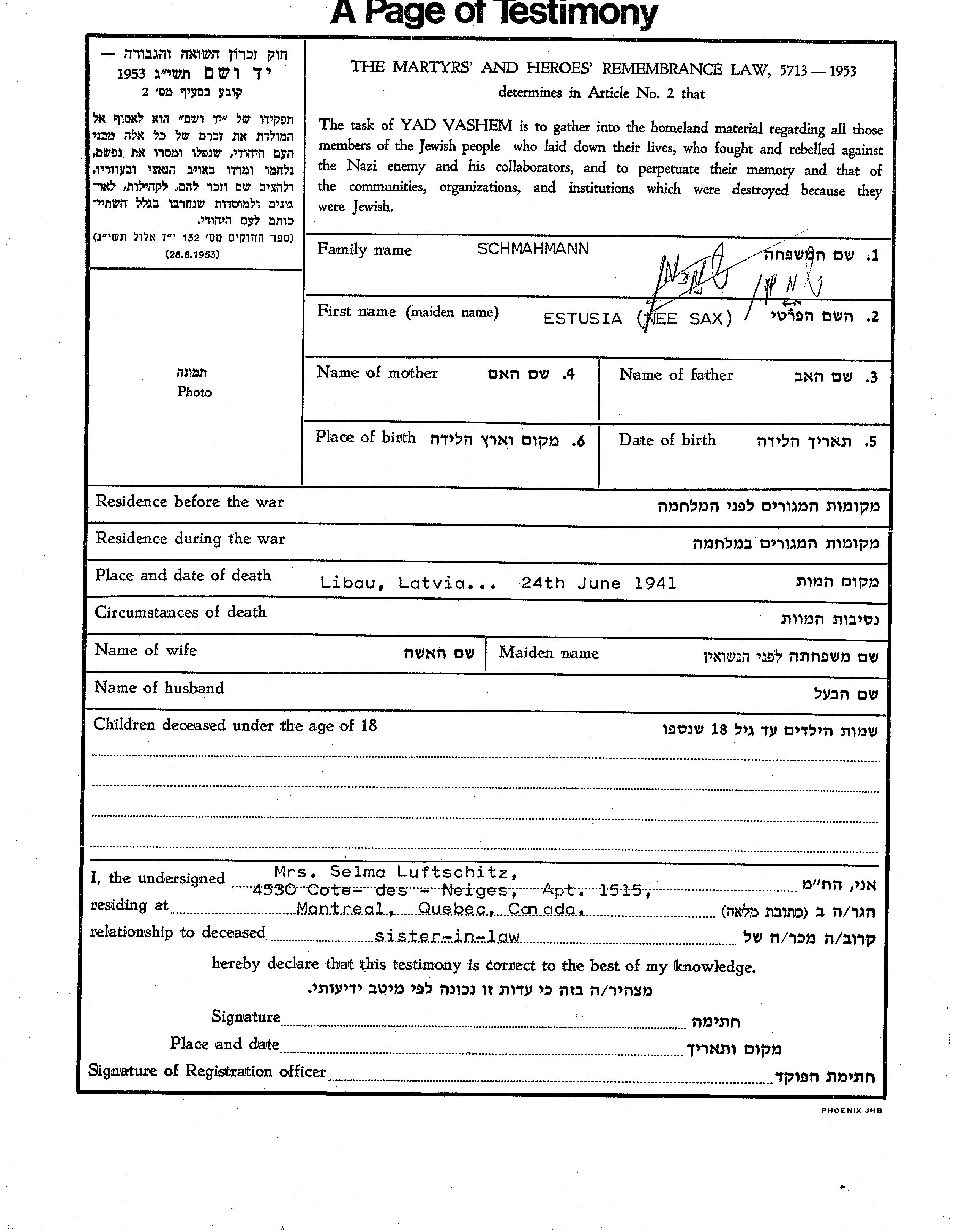 Шмаманн Эстуся место не указано, Лист свидетельских показаний