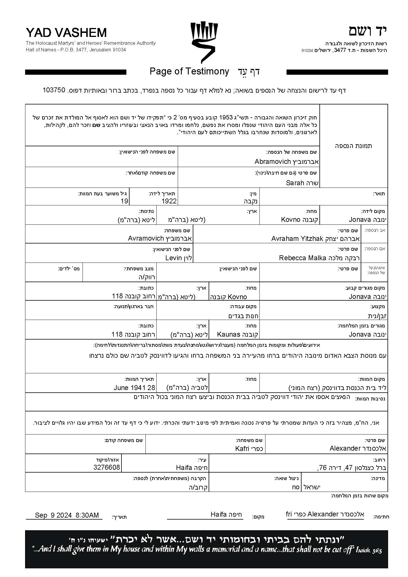 Абрамович Сара 1922 Йонава, Литва Лист свидетельских показаний (электронный)