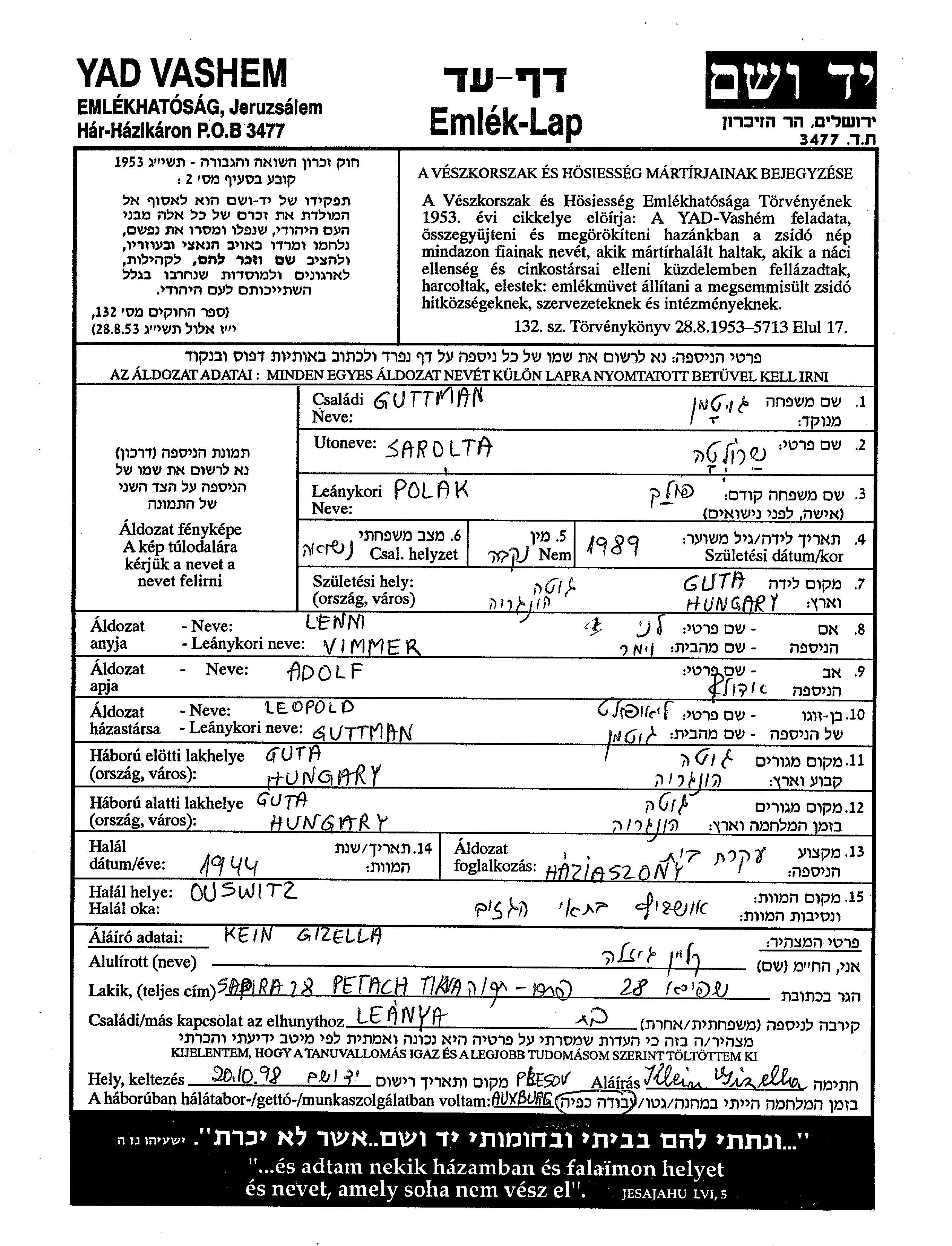 Шарольта Гуттман, девичья фамилия Поляк, место рождения: Гута, Венгрия. Отец: Адольф, mать:Хелена. Домохозяйка. Женат / замужем. Место жительства до войны: Гута, Венгрия. Место во время войны: Гута, Венгрия.