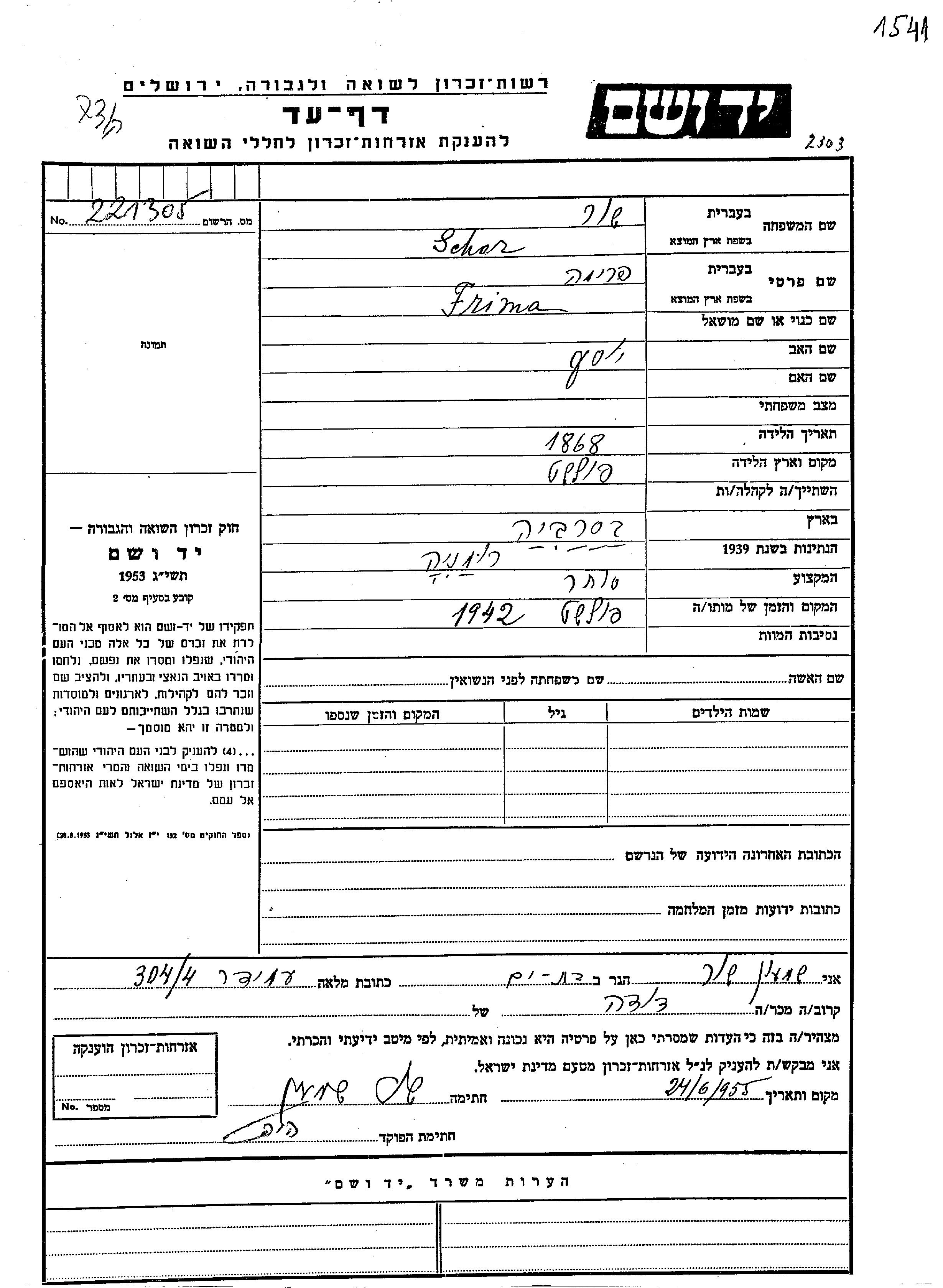 Фрима Шор, место рождения: Фалешты, Румыния. Отец: Иосеф. Торговец / торговка. Место жительства до войны: Фалешты, Румыния. Место во время войны: Фалешты, Румыния.
