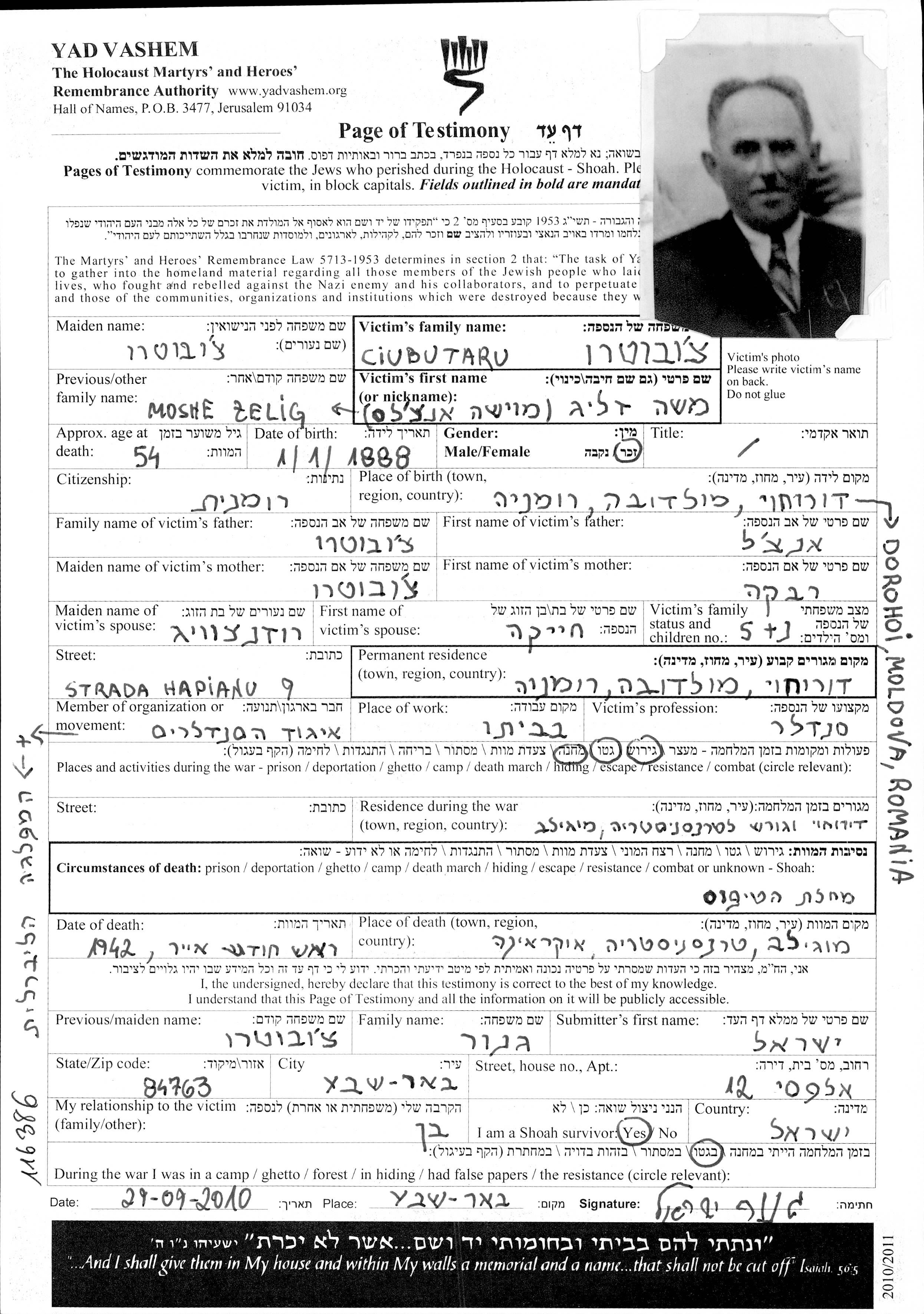 Моше Чеботару, место рождения: Дорохой, Румыния. Сапожник. Место жительства до войны: Дорохой, Румыния.