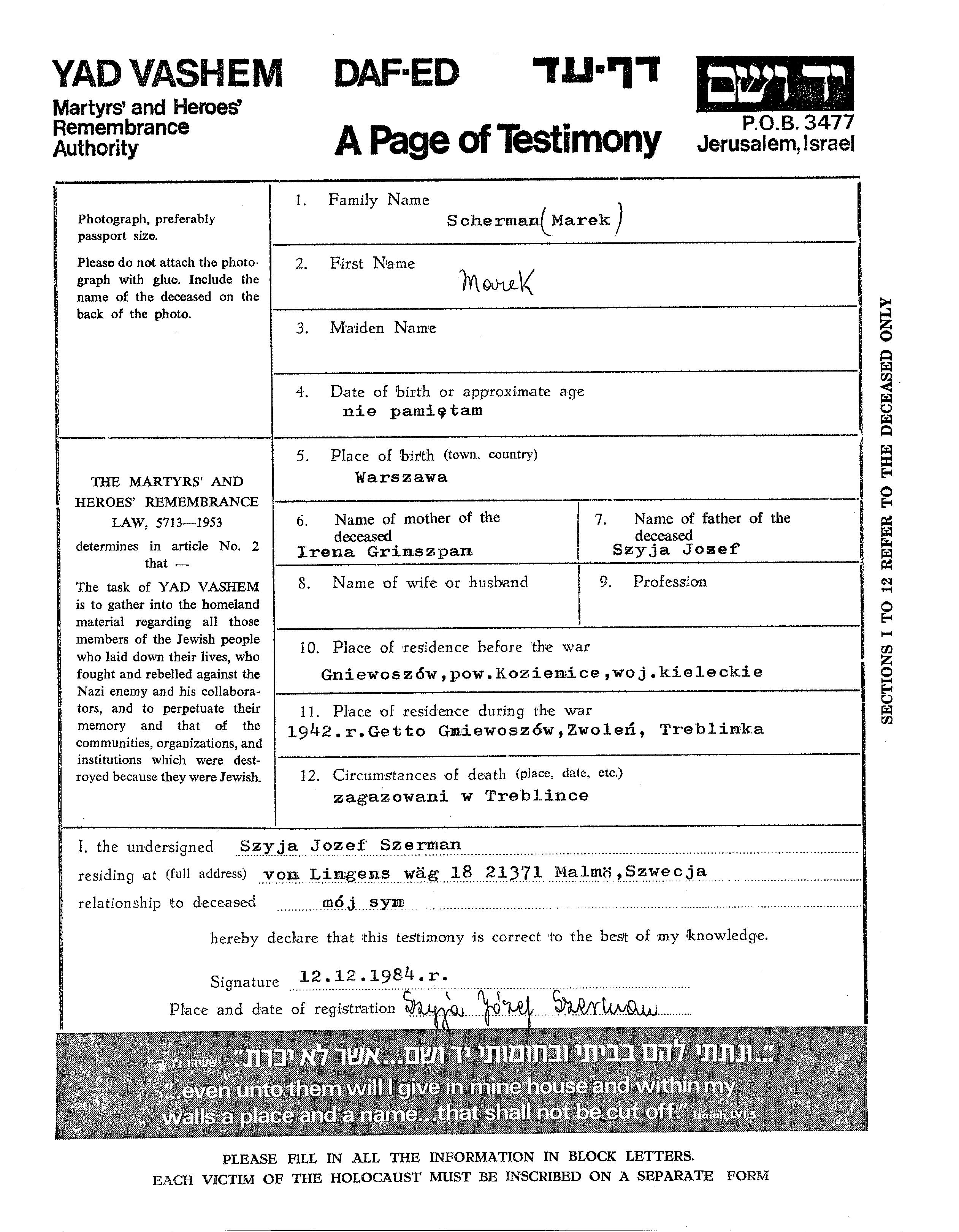 Марек Шерман, место рождения: Варшава, Польша. Отец: Шия Йозеф, mать:Ирена. Место жительства до войны: Гневошув, Польша. Место во время войны: Зволень, Польша.