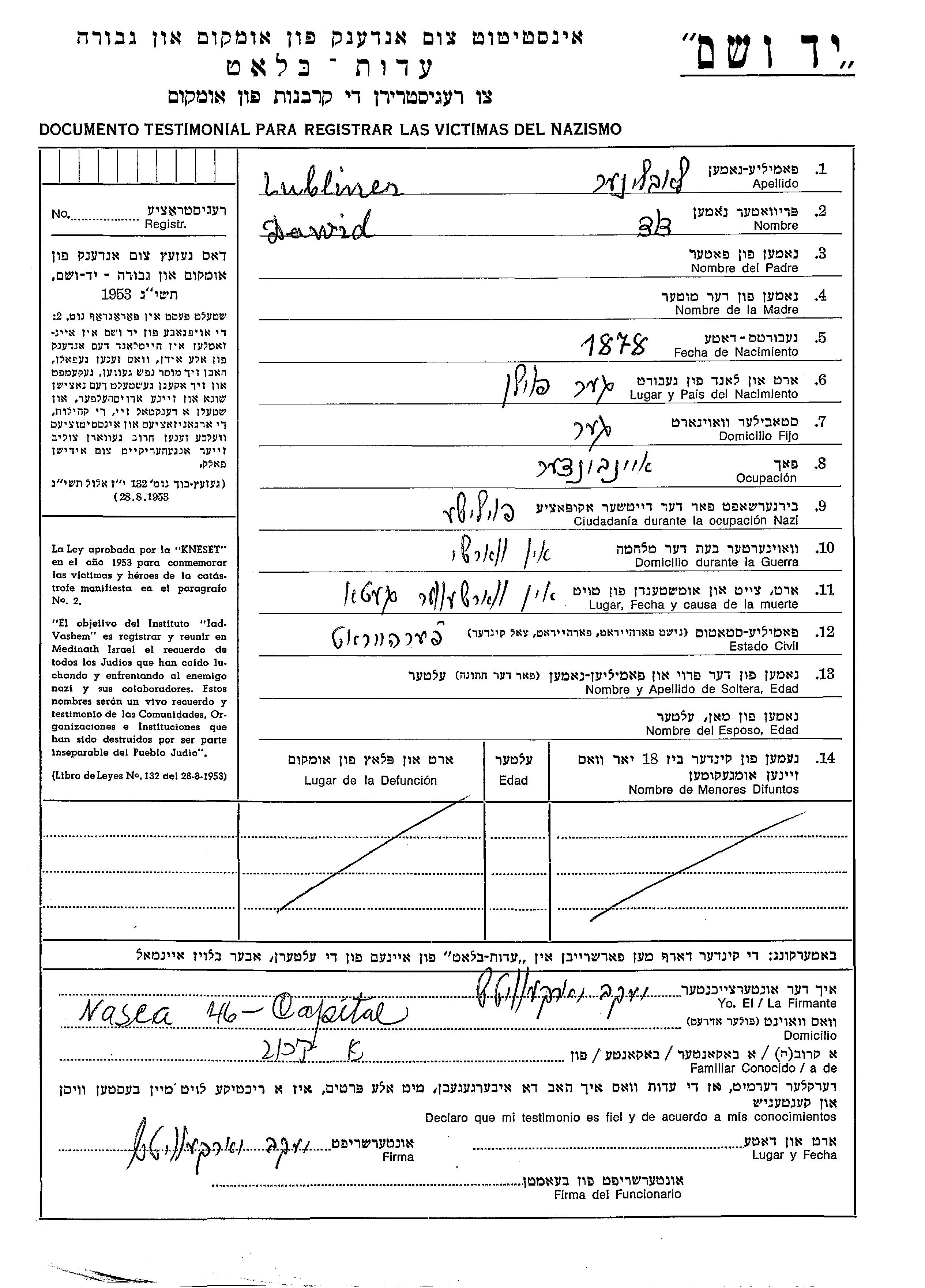Люблинер Давид 1878 Гора-Кальвария, Польша Лист свидетельских показаний