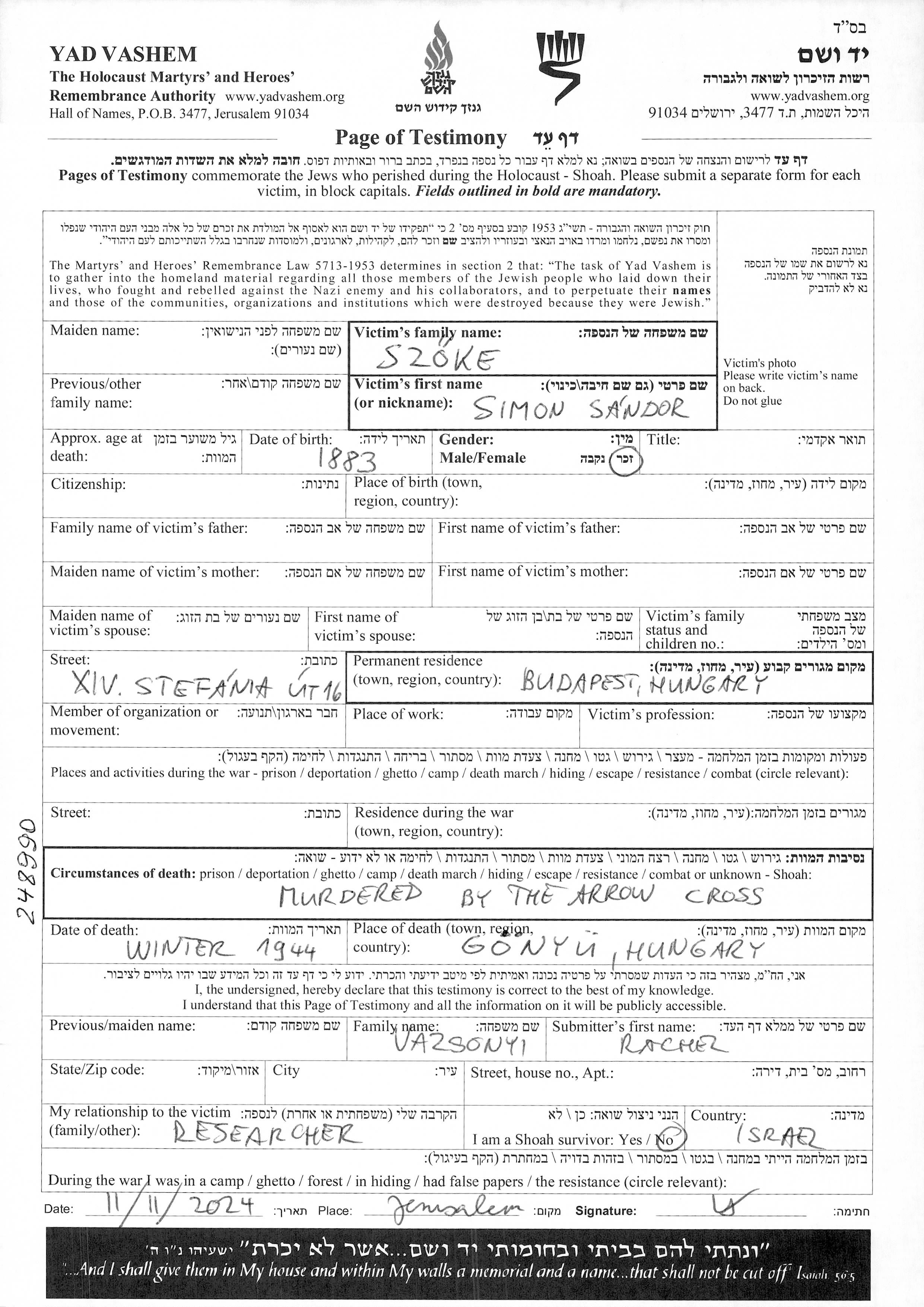 Шимон Шандор Соке, место рождения: место не указано. Hiteltudósitó iroda tulajdonos. Место жительства до войны: Будапешт, Венгрия.