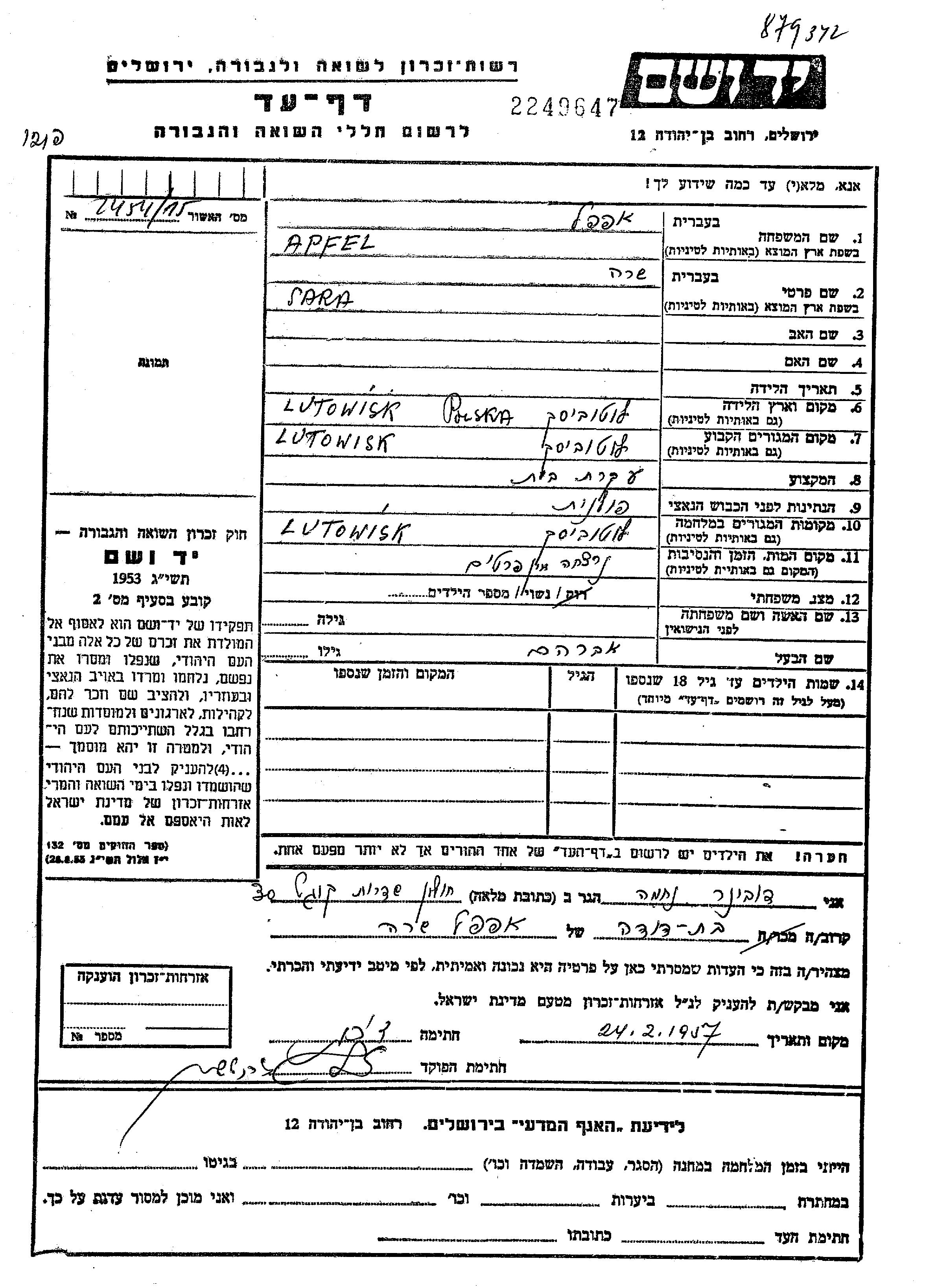 Апель Сара Лютовиска, Польша Список уничтоженных евреев из Книги Памяти