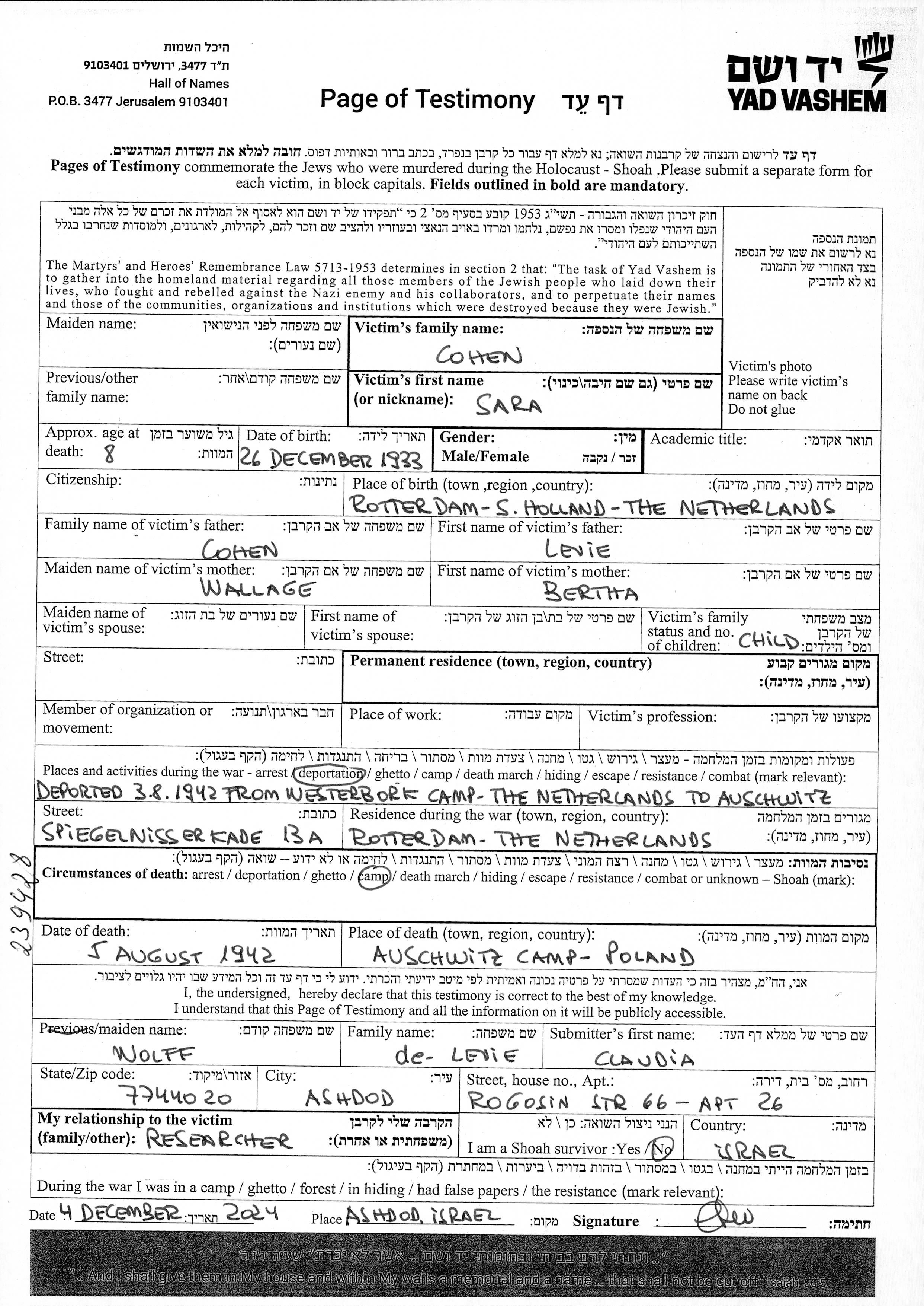 Сара уничтоженa в период Шоа. место смерти: Аушвиц, Польша.