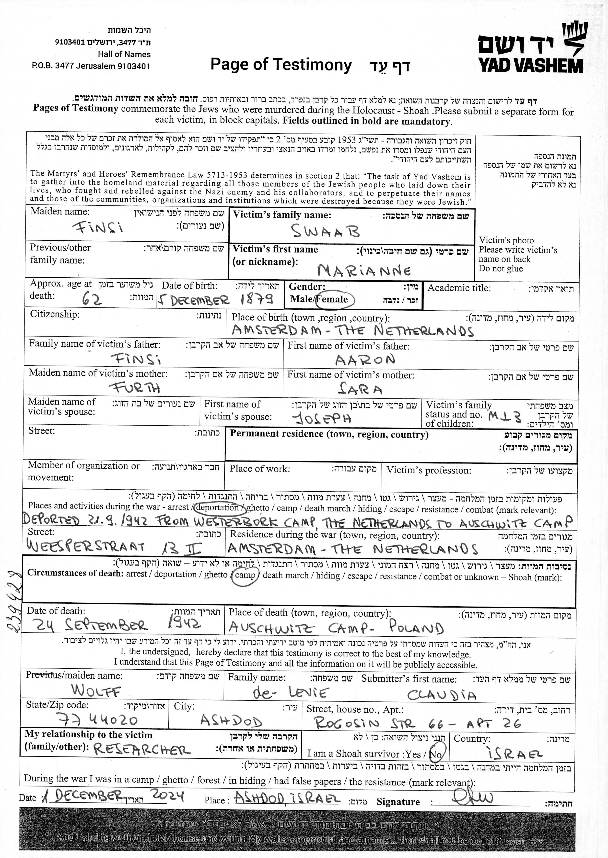 Сваб Марианне 1879 Амстердам, Нидерланды Список уничтоженных евреев из Нидерландов