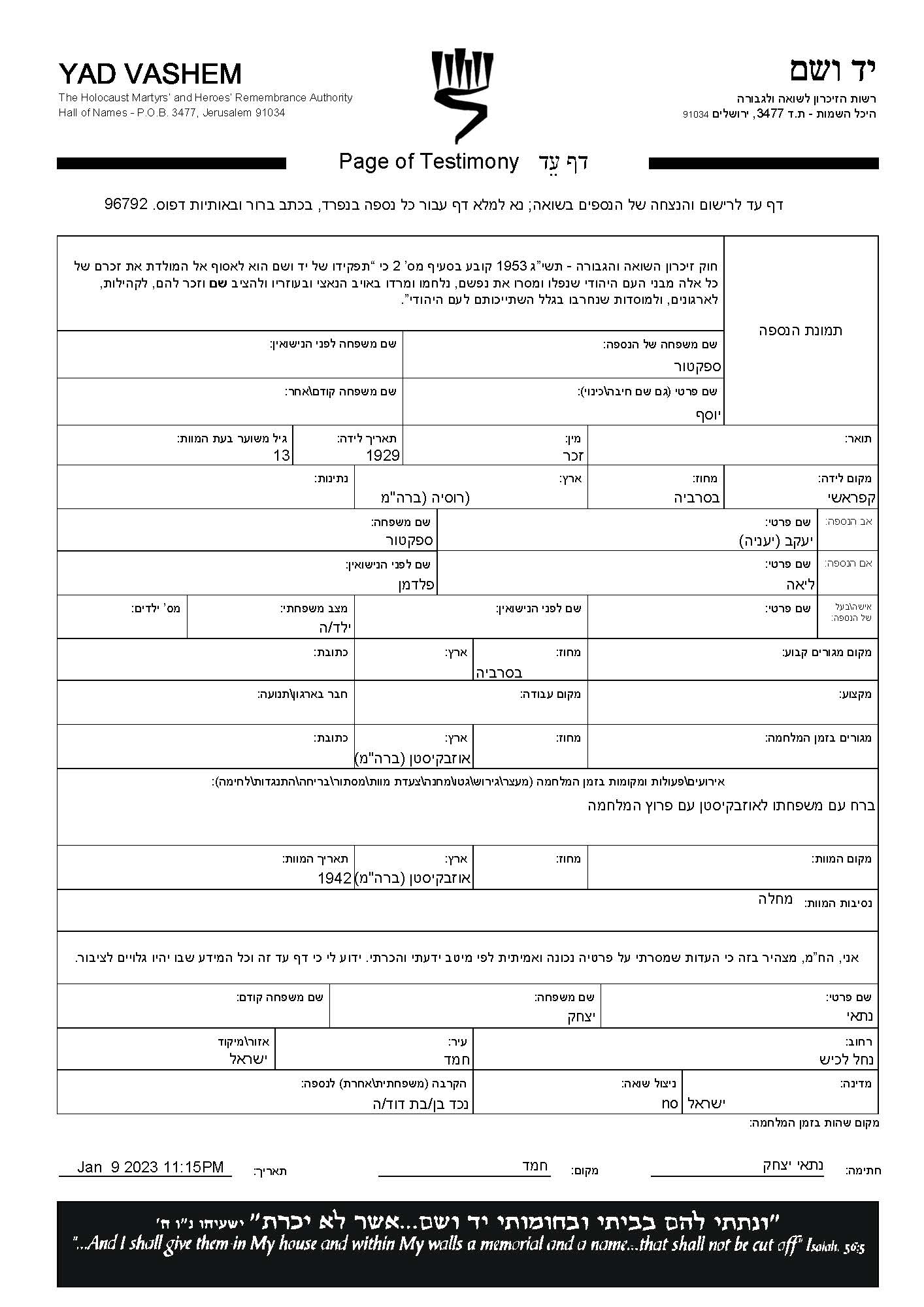 Иосеф Спектор, место рождения: Кэпрешть-Сат, Румыния. Место жительства до войны: Бессарабия, Moldova.