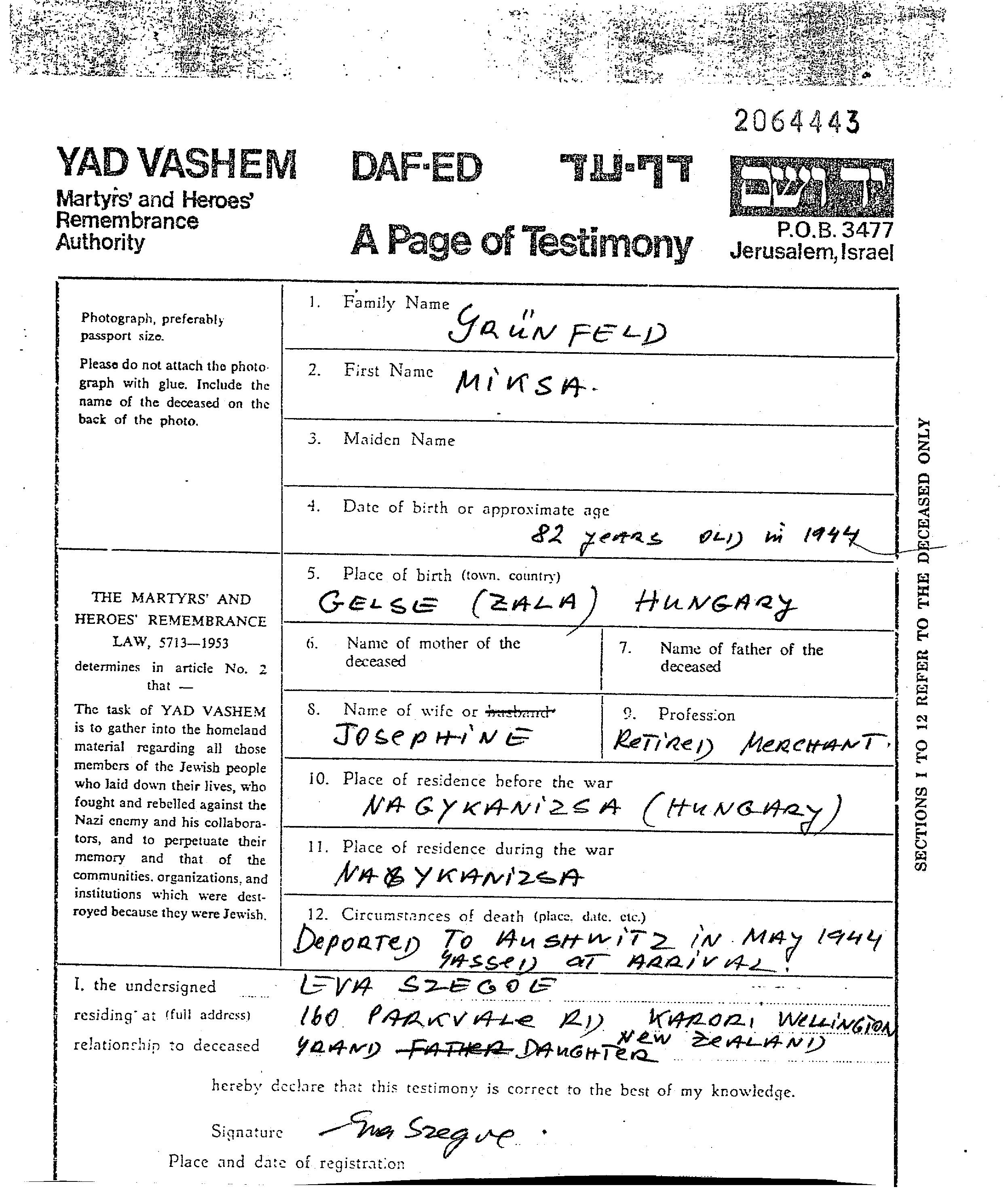 Микса Грунфельд, место рождения: Венгрия. Пенсионер / пенсионерка. Место жительства до войны: Надьканижа, Венгрия.