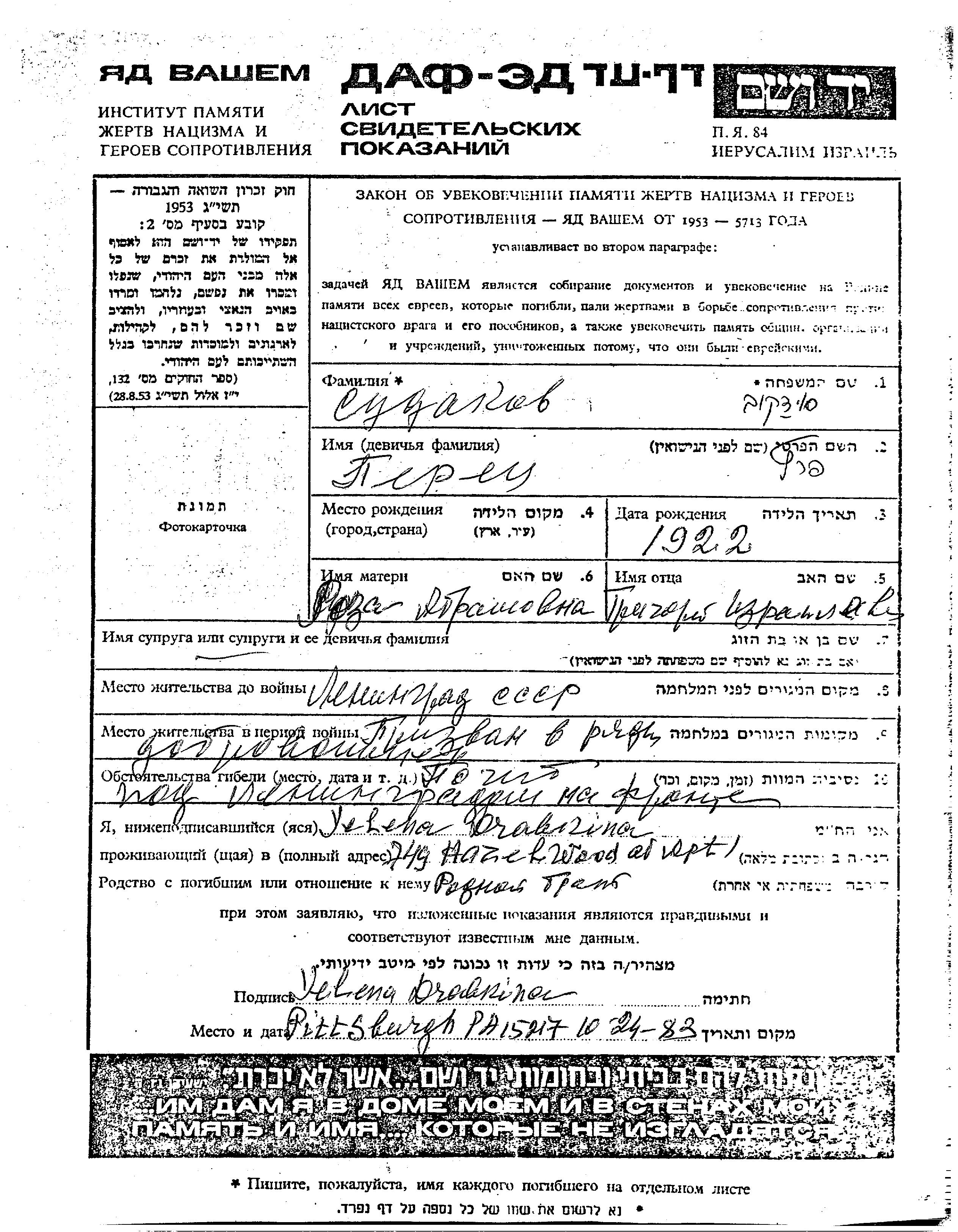 Перец Судаков, место рождения: СССР. Отец: Григорий, mать:Роза. Холост / не замужем. Место жительства до войны: Ленинград, Россия (СССР). Место во время войны: Вооруженные силы Советского Союза. Перец погиб на военной службе. место смерти: Ленинград, Россия (СССР).