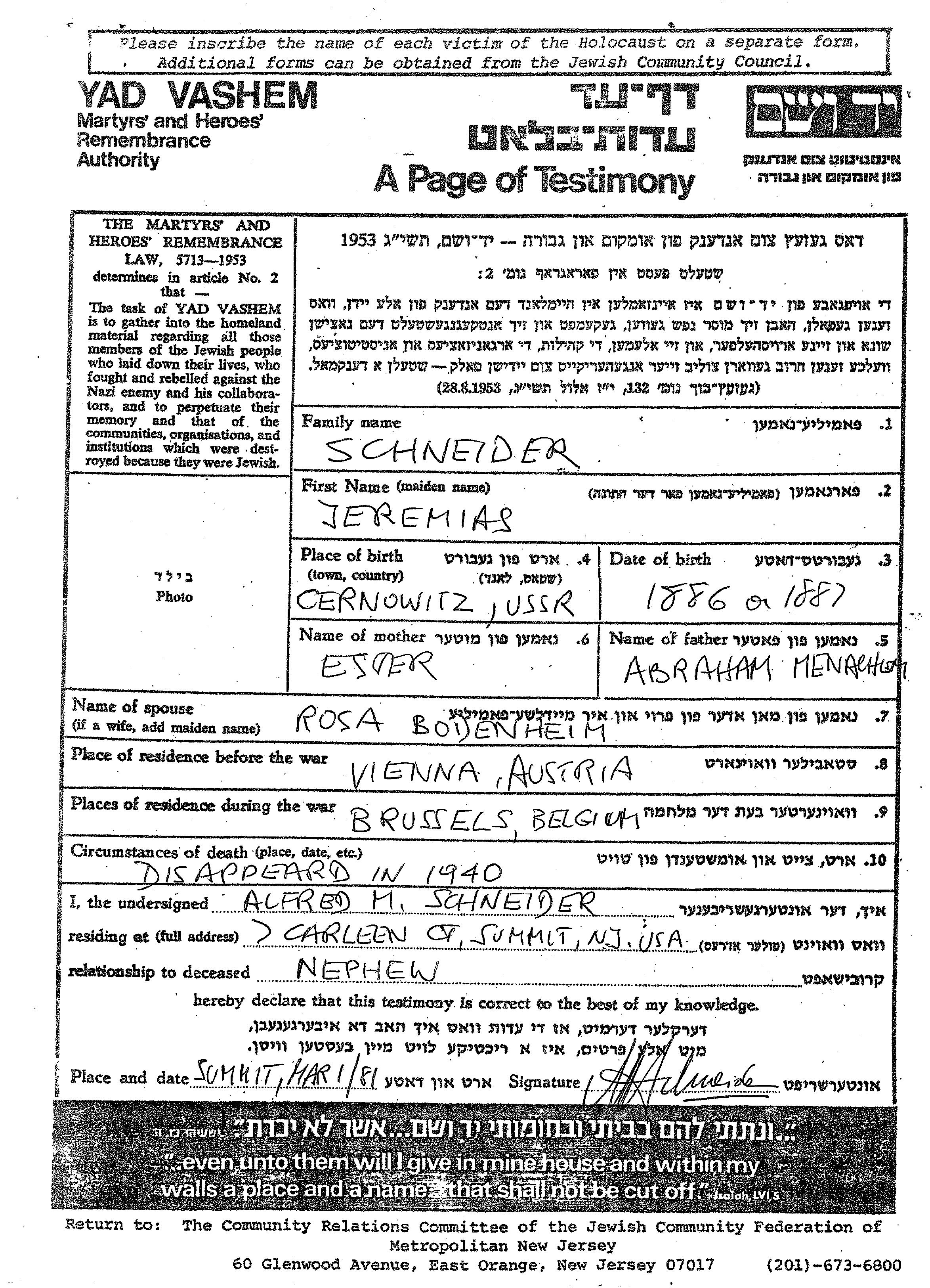 Еремиас Шнайдер, место рождения: Черновиц, Румыния. Отец: Абраам Менахем, mать:Эстер. Женат / замужем. Место жительства до войны: Вена, Австрия. Место во время войны: Брюссель, Бельгия.