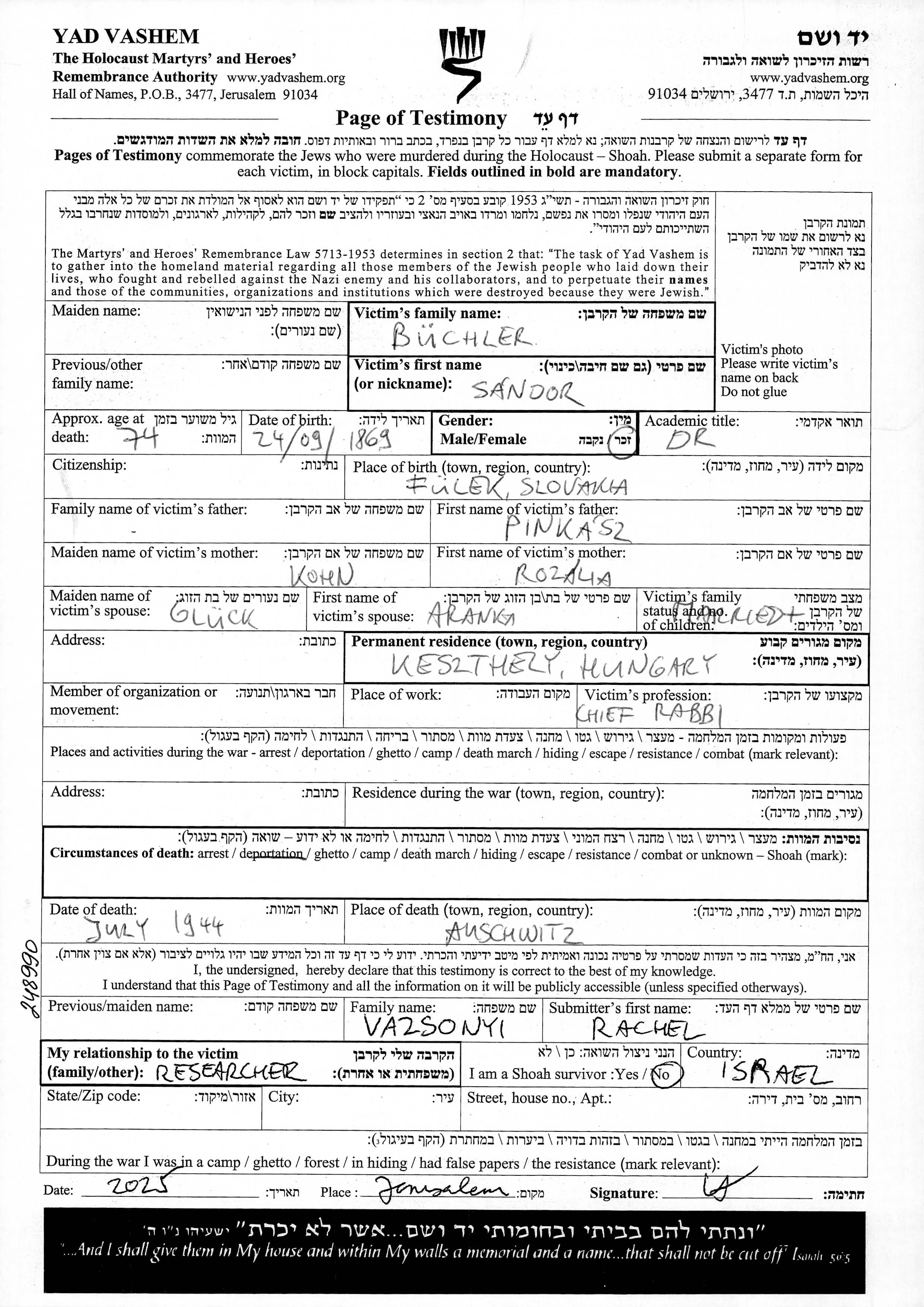 Бюхлер | Шандор | 1869 | Кестхей, Венгрия | Лист свидетельских показаний |