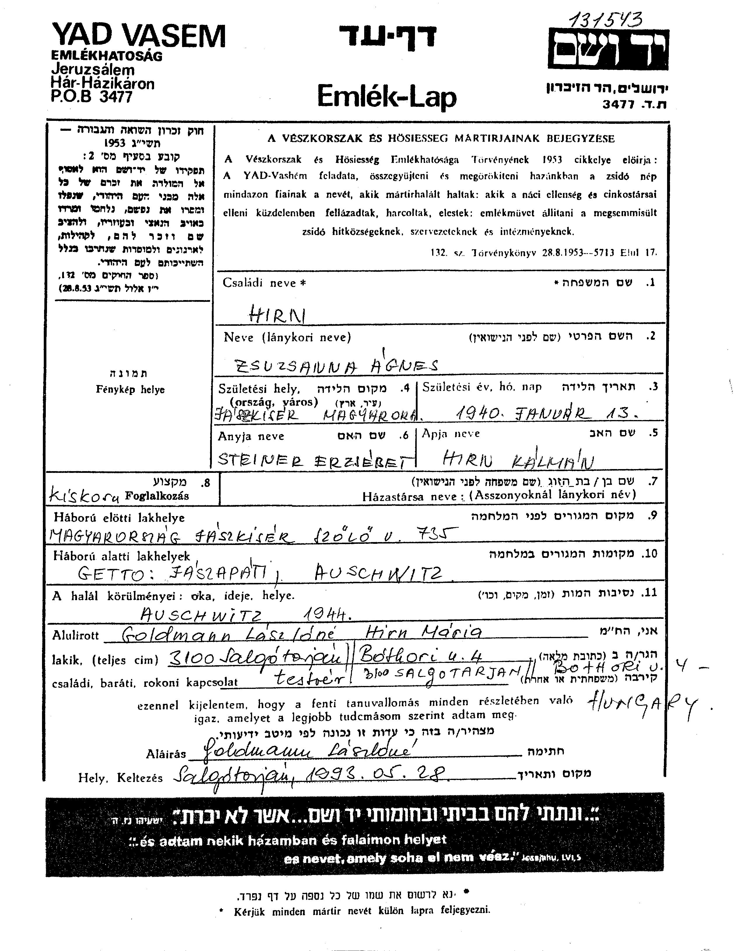 Зузана Агнес Хирн, место рождения: Яскишер, Венгрия. Место жительства до войны: Яскишер, Венгрия.