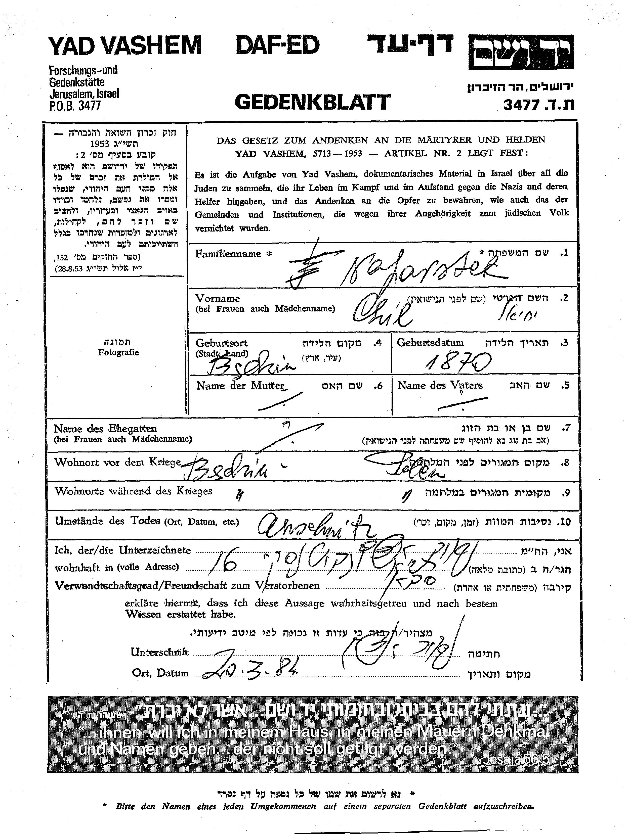 Хиль Напарстек, место рождения: Бендзин, Польша. Место жительства до войны: Бендзин, Польша. Место во время войны: Бендзин, Польша.