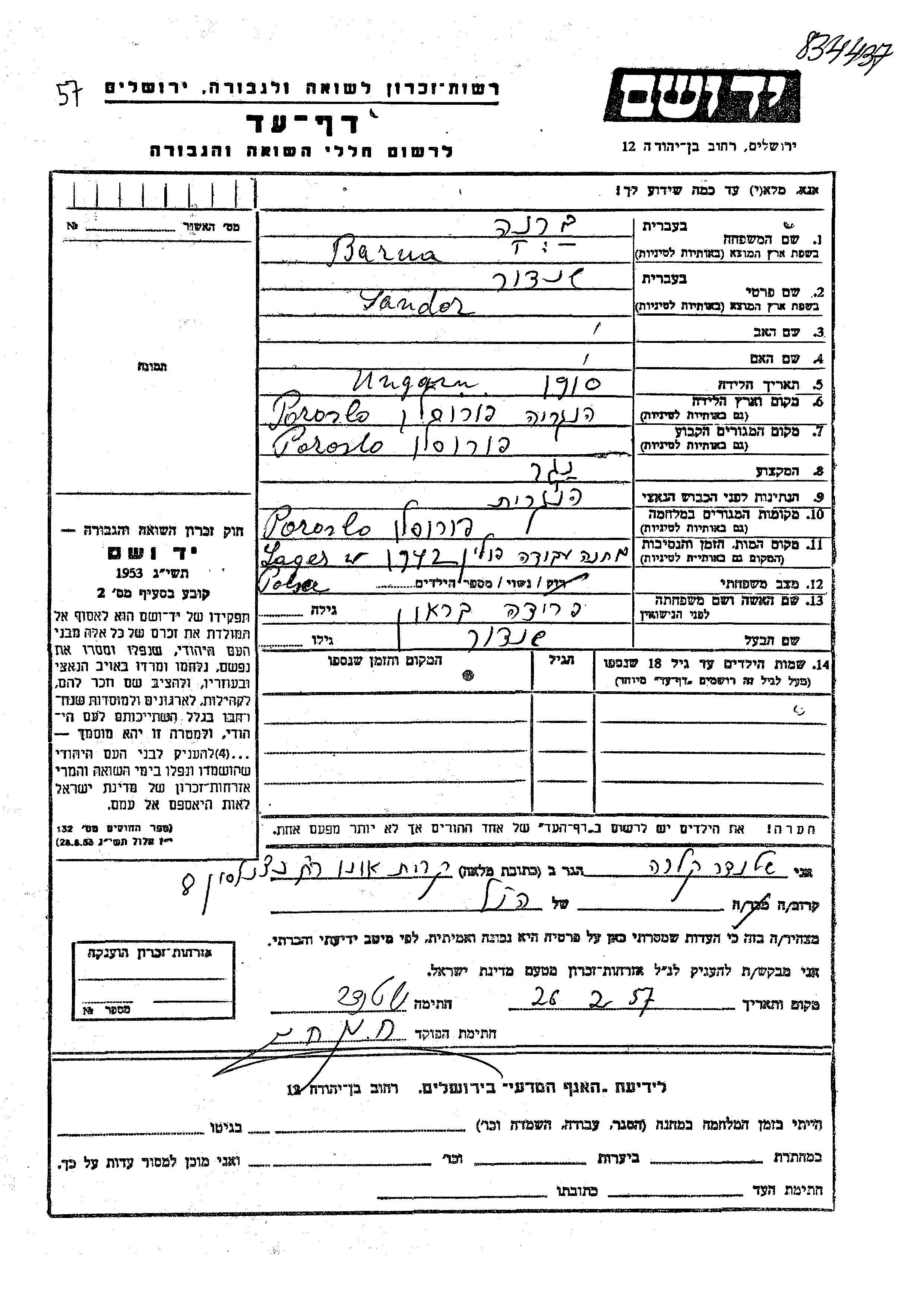 Барна Сандор 1910 Поросло, Венгрия Лист свидетельских показаний