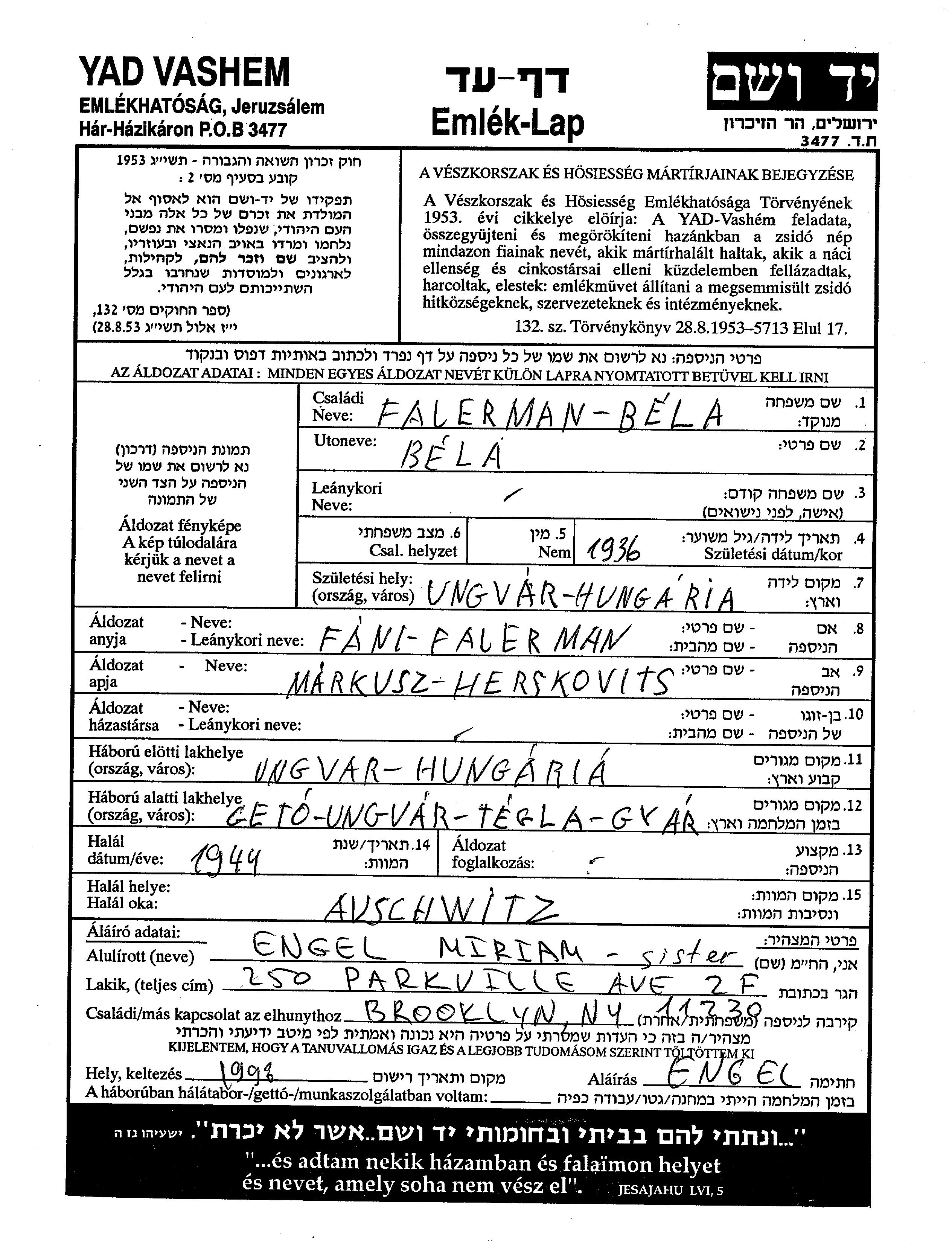 Бела Хершковиц Фалерман родился/родилась, место рождения: Унгвар, Чехословакия. Отец: Маркуш, mать:Фани. Холост / не замужем. Место жительства до войны: Унгвар, Чехословакия. Место во время войны: Унгвар, Чехословакия.