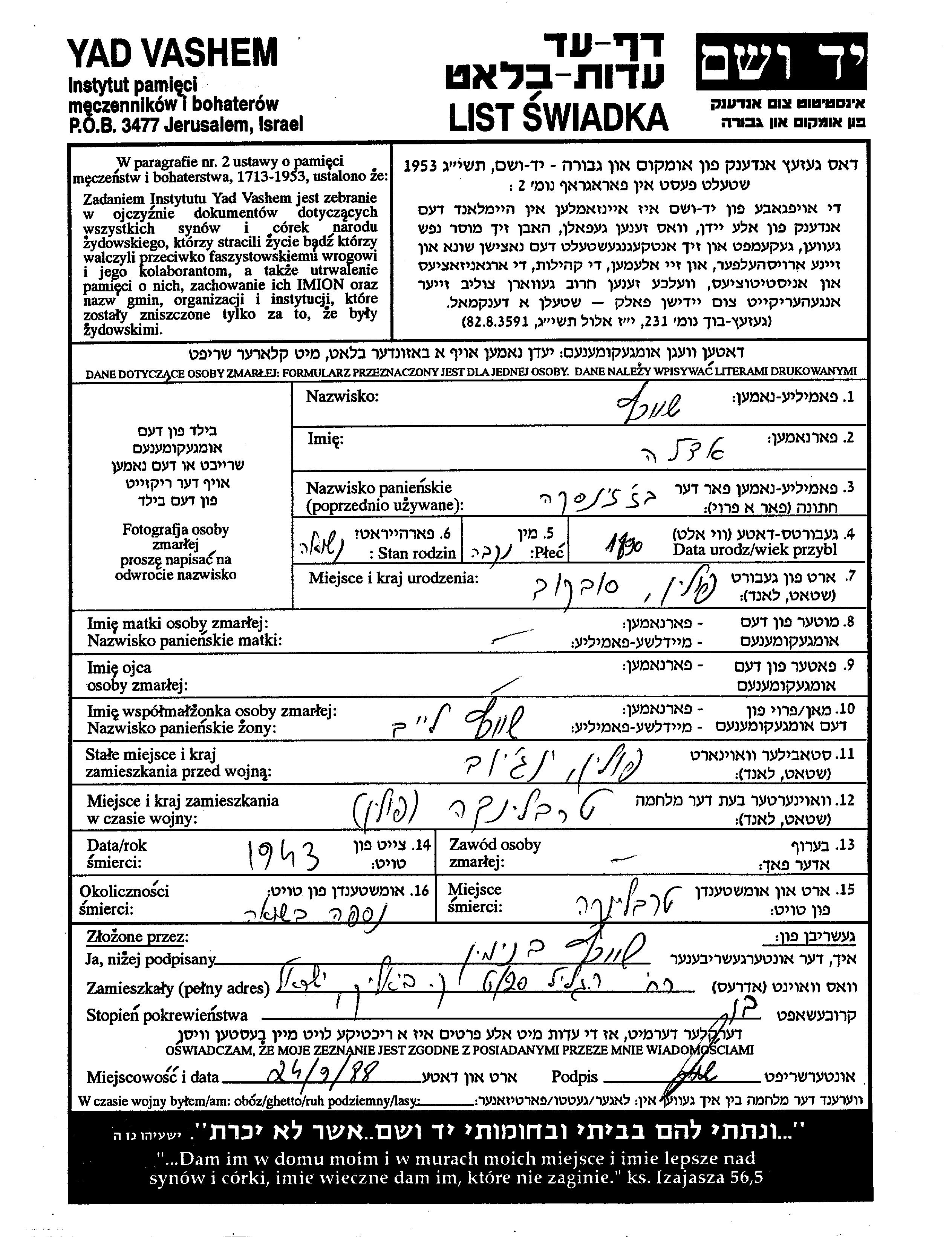 Яд Вашем - Листы свидетельских показаний Мемориального фонда