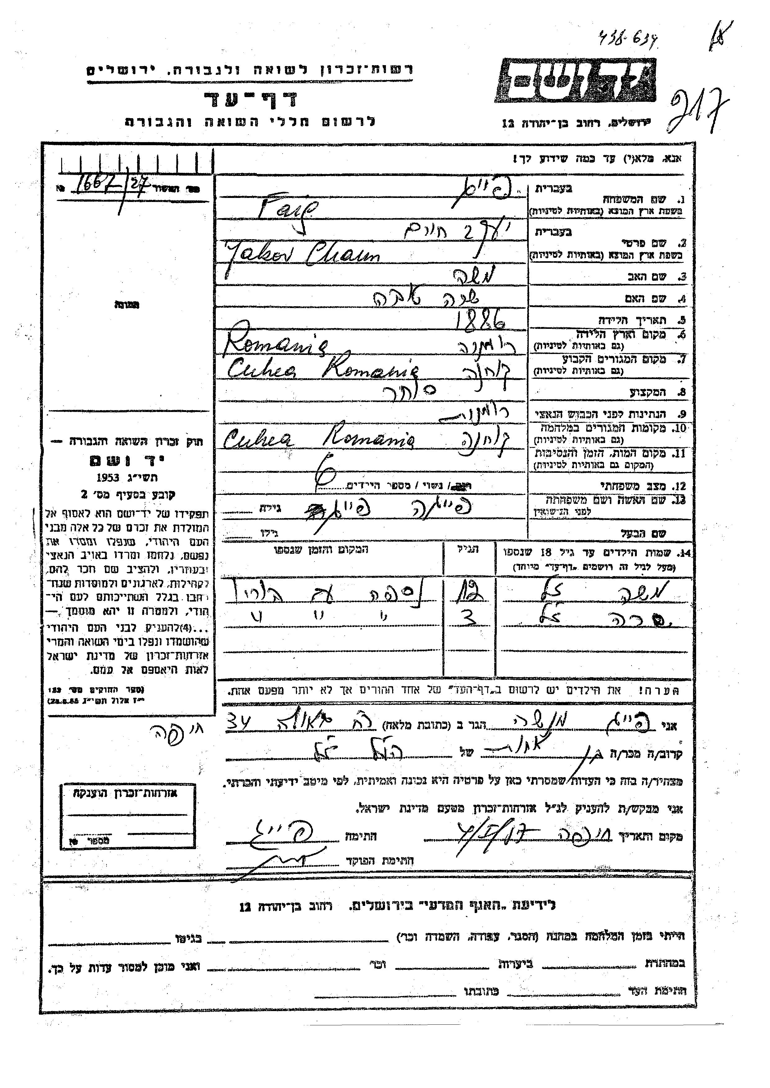 Яков Хаим Файг, место рождения: Румыния. Место жительства до войны: Коханы, Румыния.