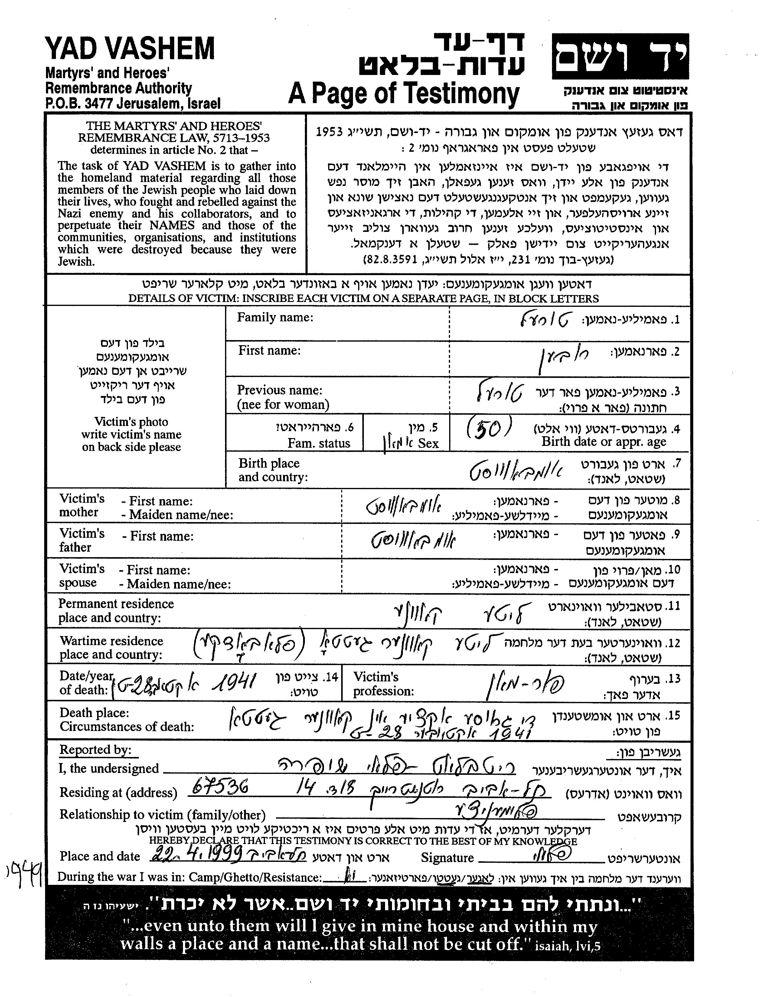 Яд Вашем - Листы свидетельских показаний Мемориального фонда