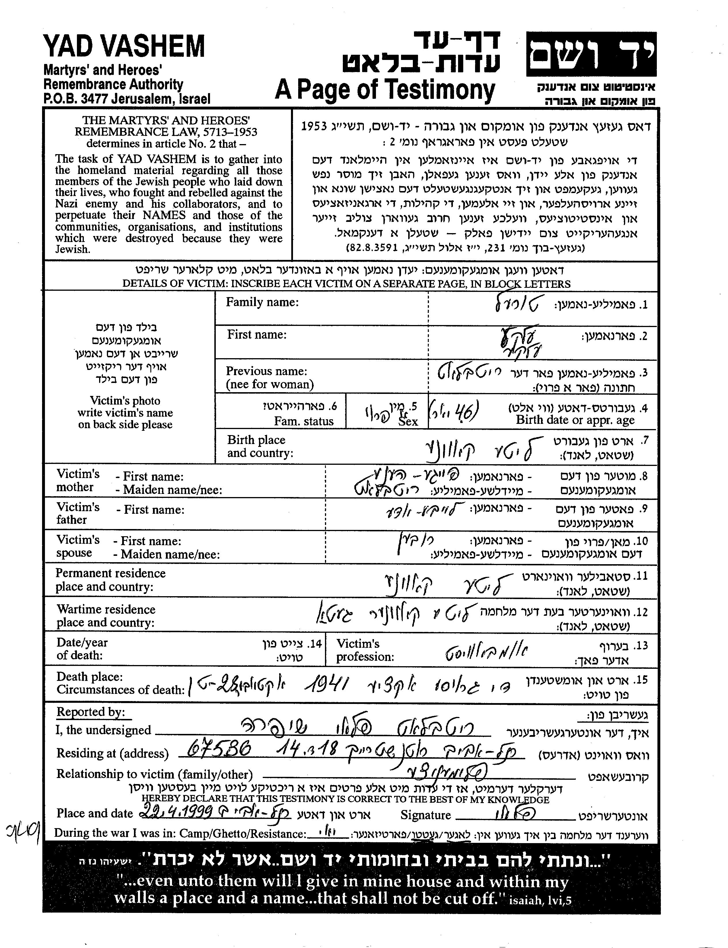 Яд Вашем - Листы свидетельских показаний Мемориального фонда