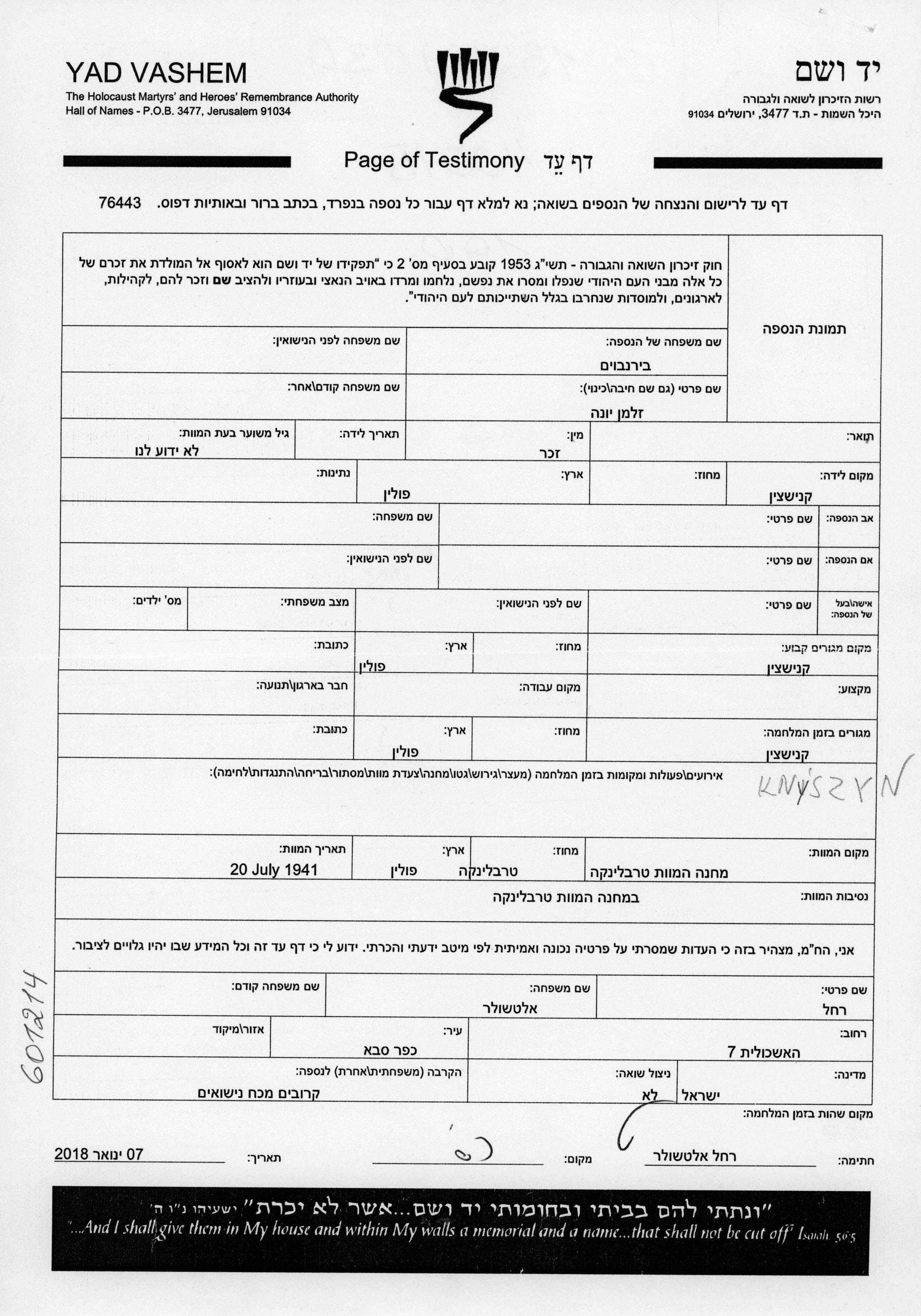 Бирнбоим Залман Иона Кнышин, Польша Лист свидетельских показаний (электронный, с подписью)
