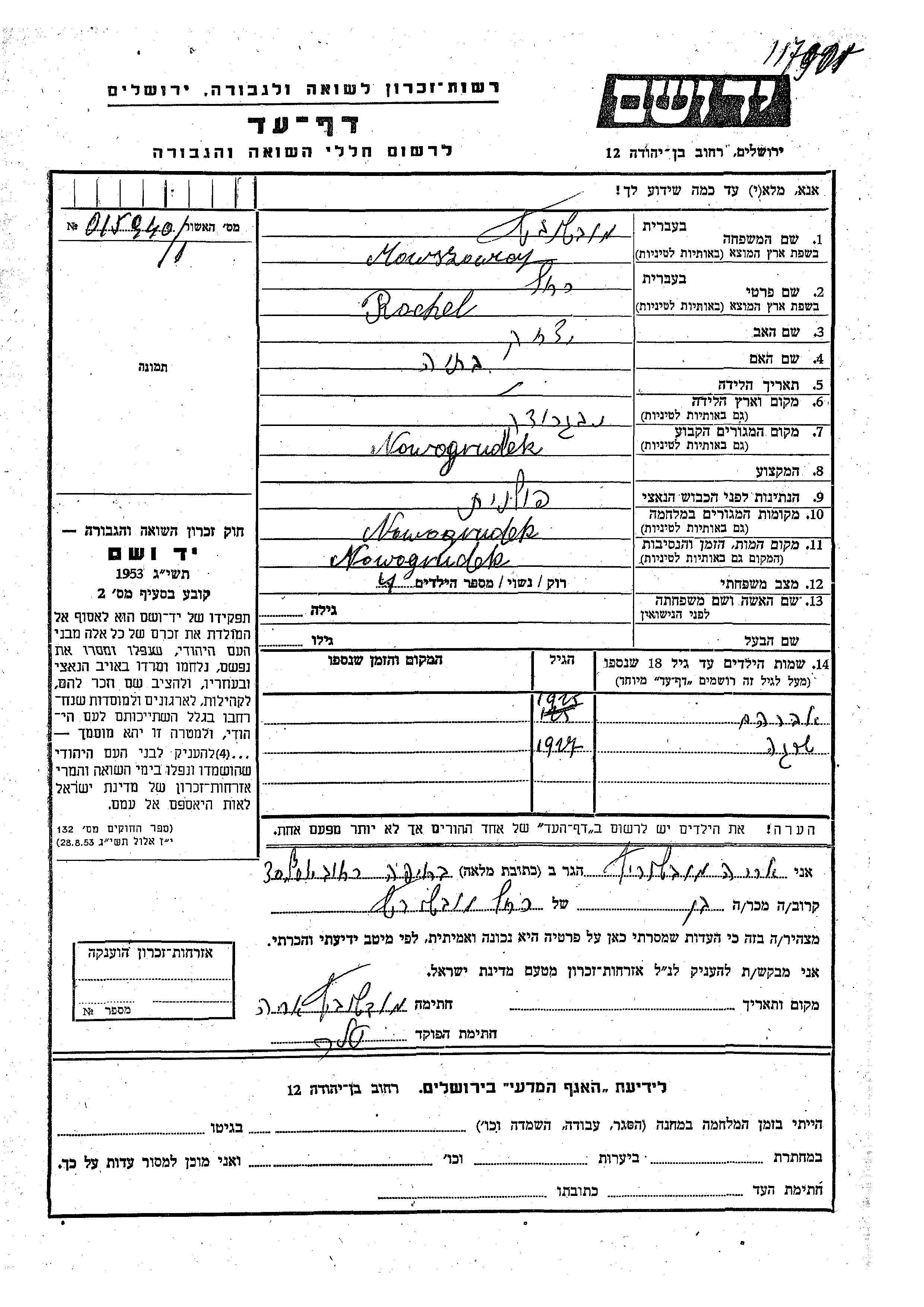 Рахель Мовшович, место рождения: Новогрудок, Польша. Отец: Ицхак, mать:Батья. Женат / замужем. Место жительства до войны: Новогрудок, Польша. Место во время войны: Новогрудок, Польша.