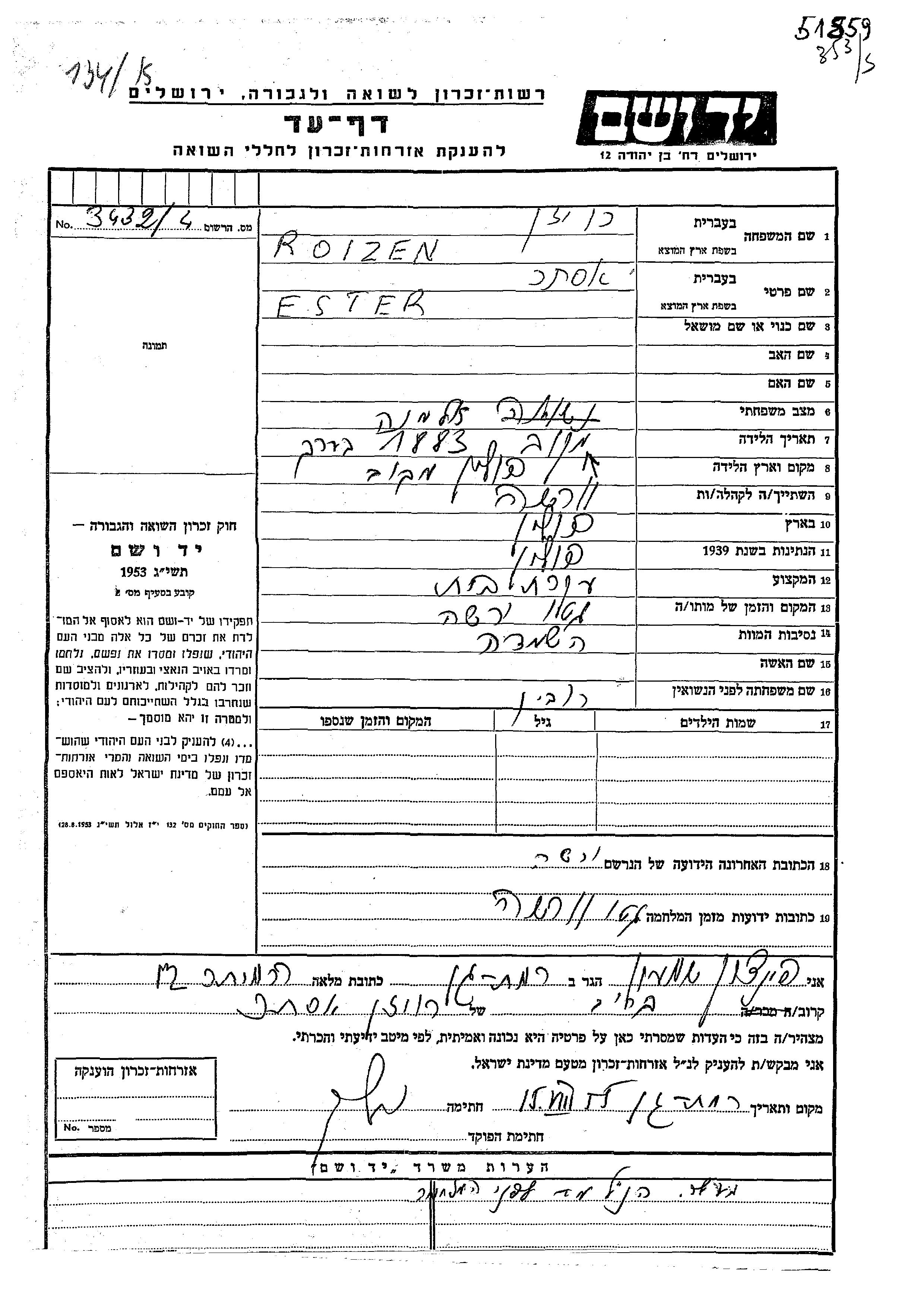 Эстер Ройзен, место рождения: Польша. Домохозяйка. Место жительства до войны: Варшава, Польша. Место во время войны: Варшава, Польша.