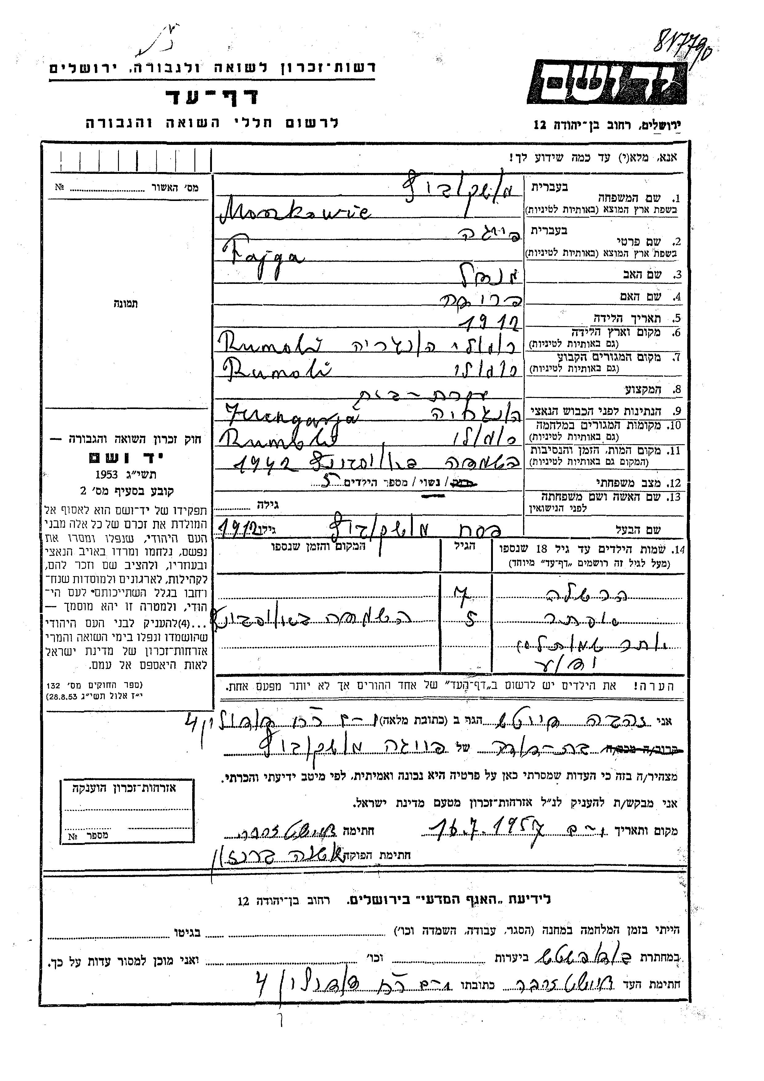 Мошковиц Файга 1912 Румоли, Румыния Лист свидетельских показаний
