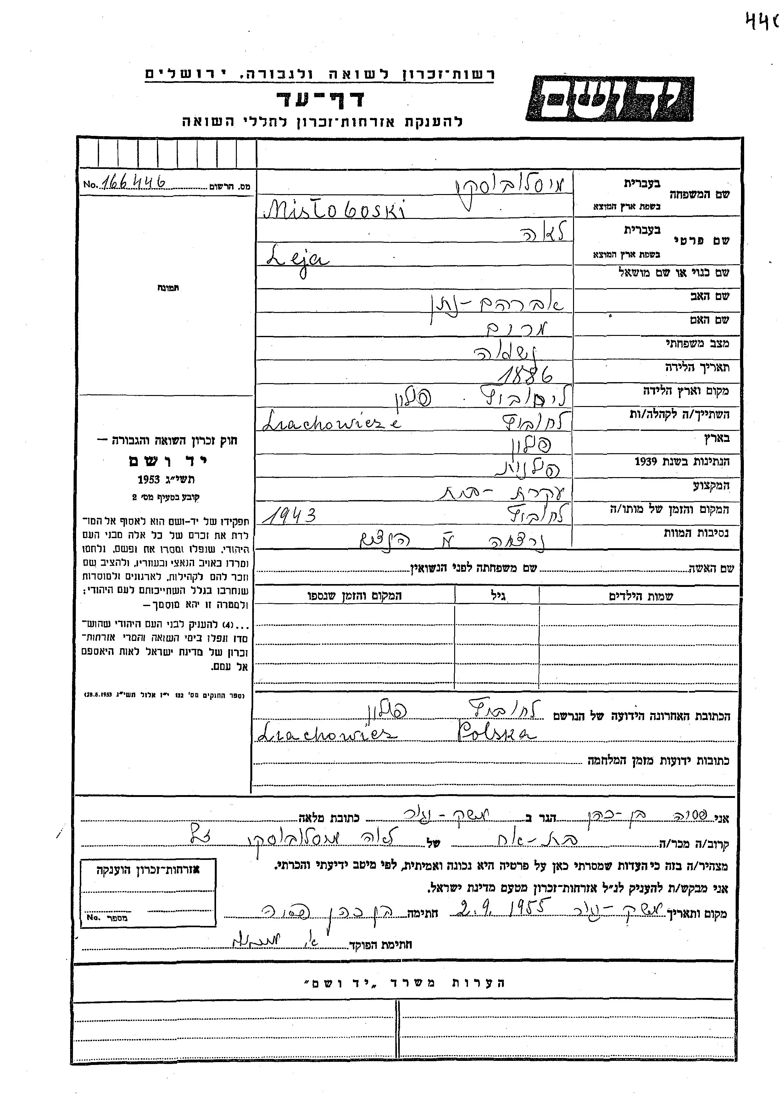 Лея Масловски Мислобоски, место рождения: Ляховичи, Польша. Отец: Авраам Натан, mать:Мирьям. Домохозяйка. Место жительства до войны: Ляховичи, Польша. Место во время войны: Ляховичи, Польша.