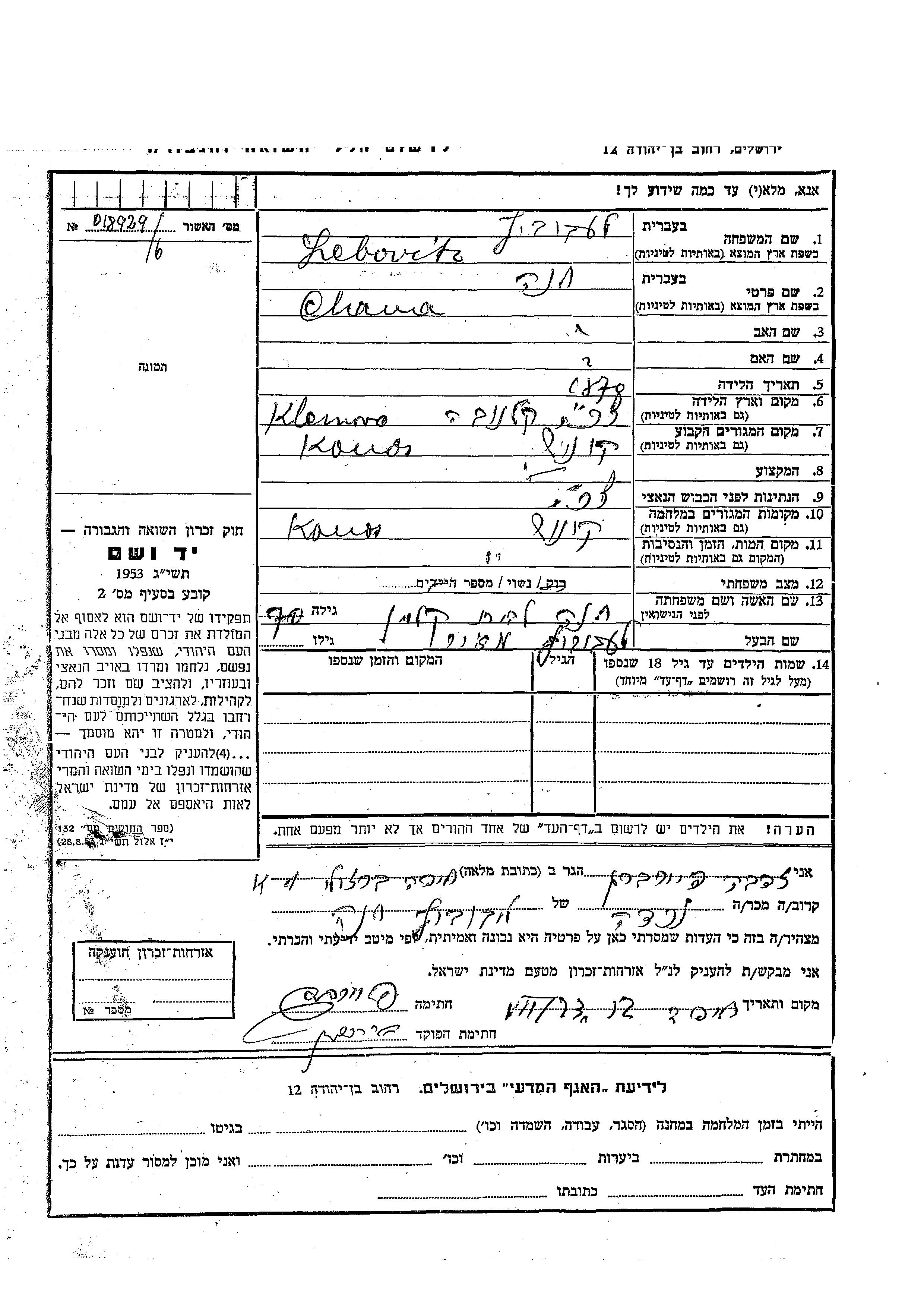 Яд Вашем - Листы свидетельских показаний Мемориального фонда