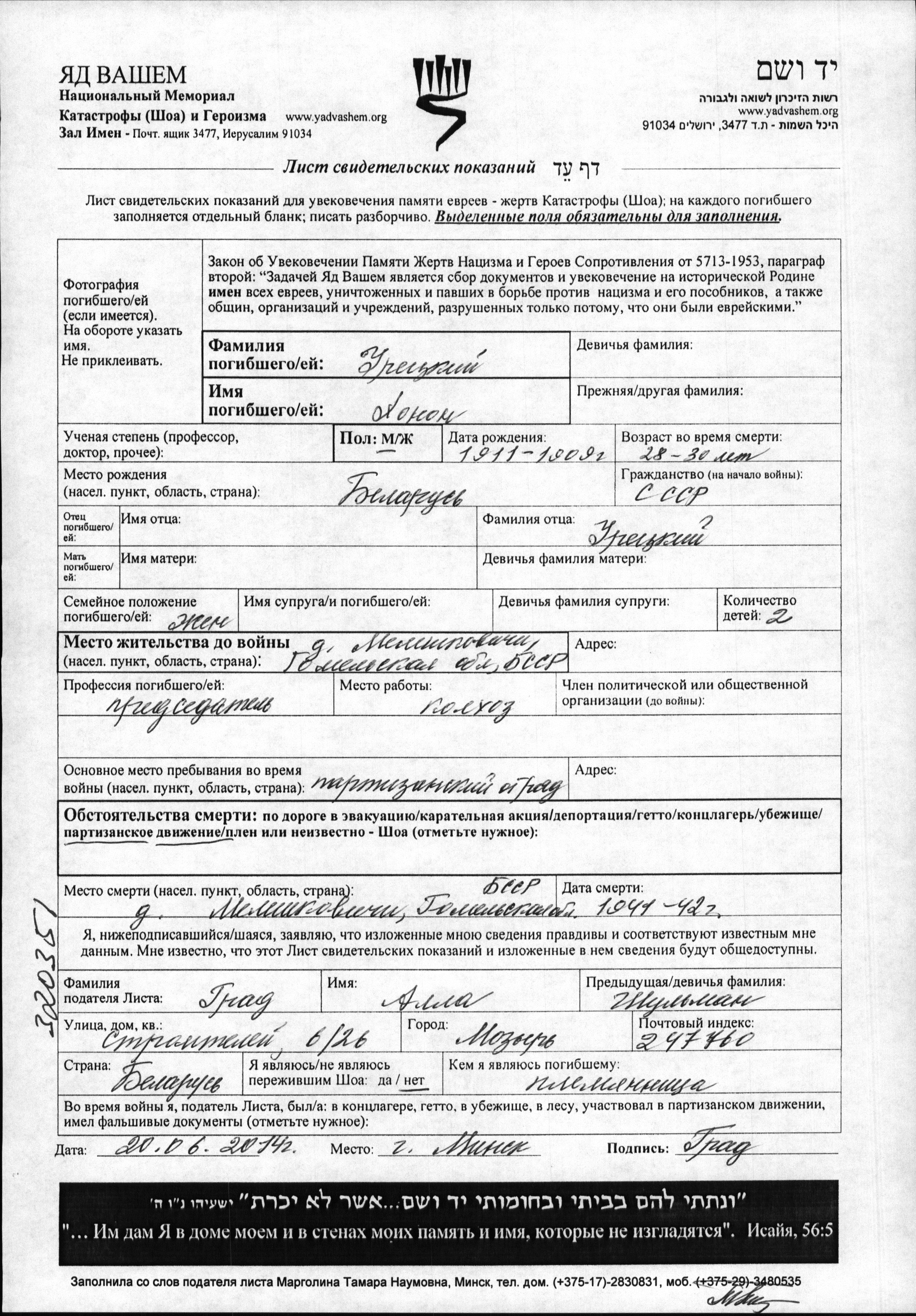 Урецкий Хонон 1904 Мелешковичи, Белоруссия (СССР) Лист свидетельских показаний