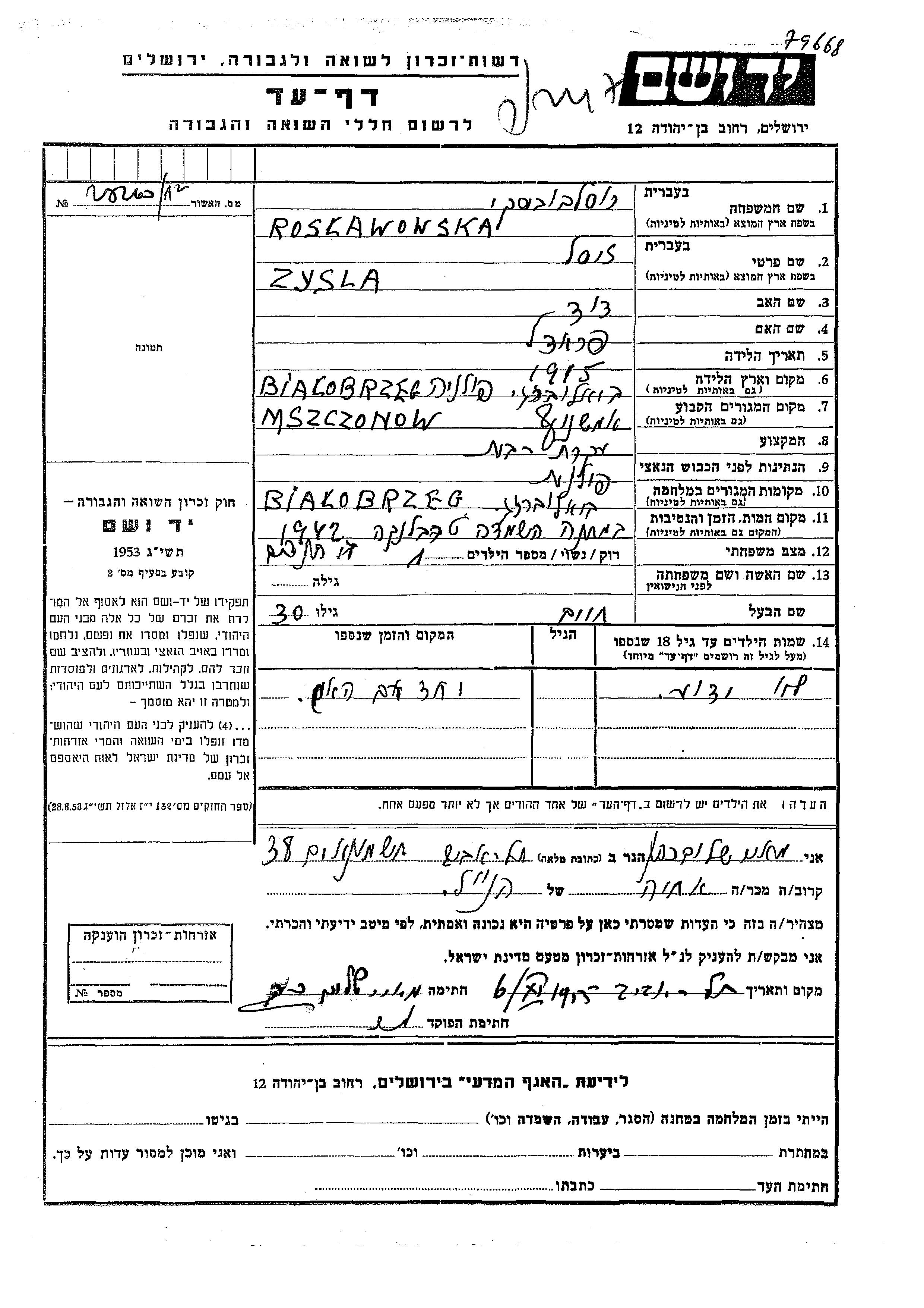 Зисл Рославовска, место рождения: Бялобжег, Польша. Отец: Давид, mать:Фрадель. Домохозяйка. Женат / замужем. Место жительства до войны: Мщонув, Польша. Место во время войны: Бялобжег, Польша.
