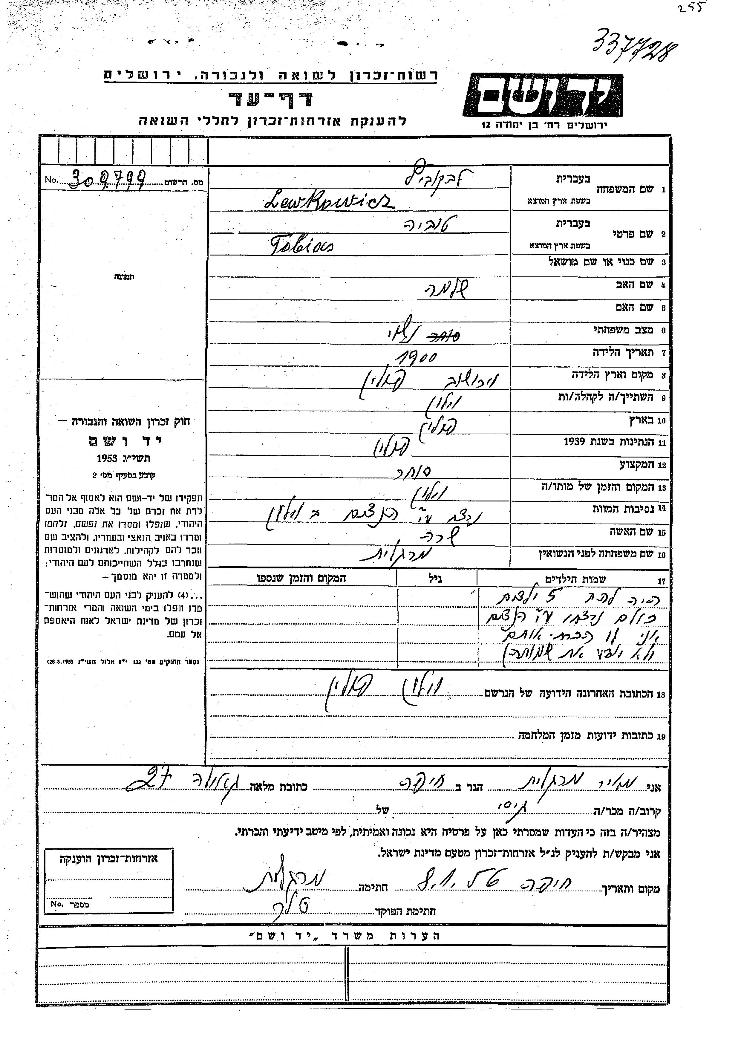 Тобиас Тувия Левкович, место рождения: Верушув, Польша. Отец: Шломо. Торговец / торговка. Женат / замужем. Место жительства до войны: Велюнь, Польша.