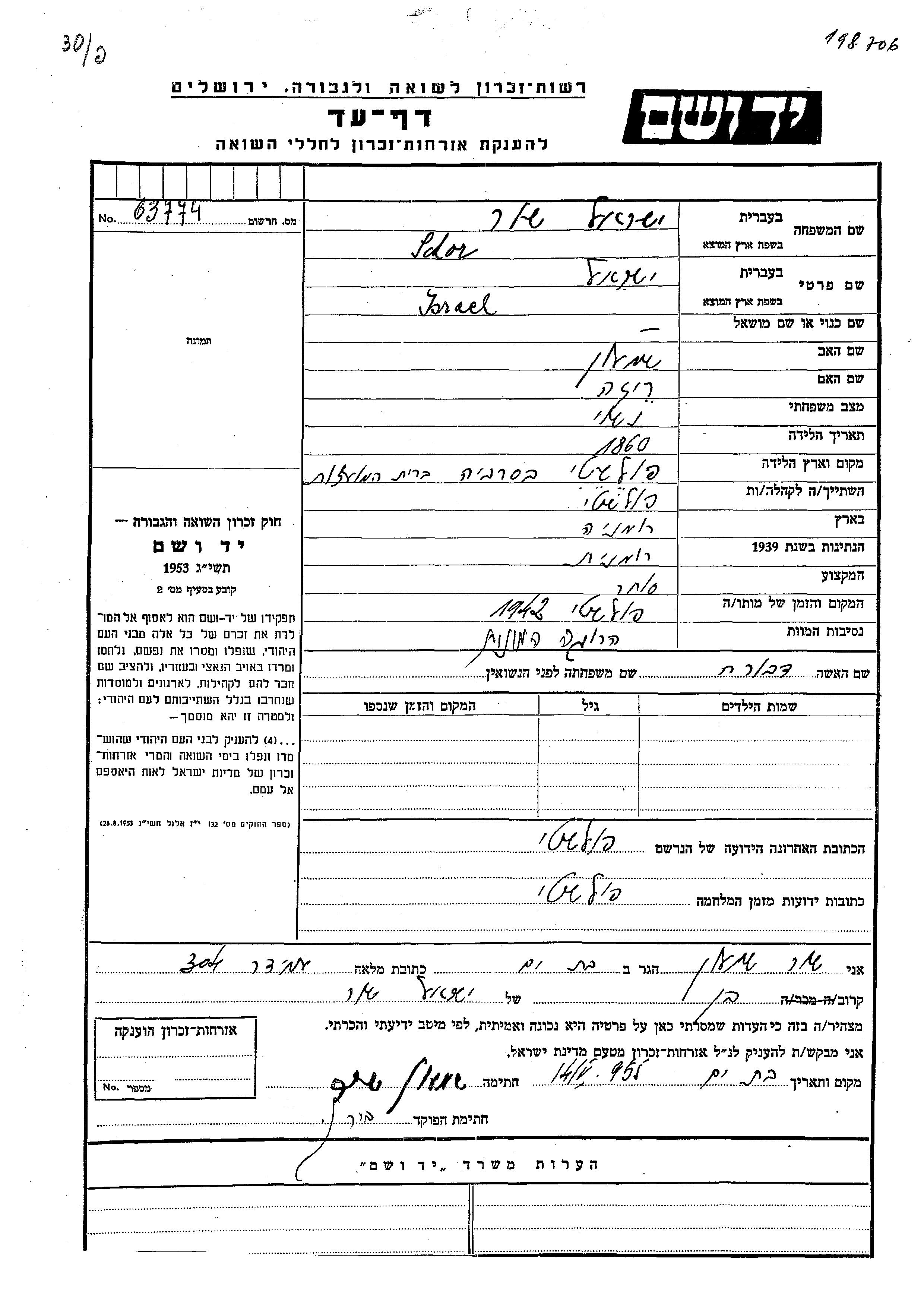 Исраэль Шор, место рождения: Фалешты, Румыния. Отец: Шимон, mать:Риза. Торговец / торговка. Женат / замужем. Место жительства до войны: Фалешты, Румыния. Место во время войны: Фалешты, Румыния.