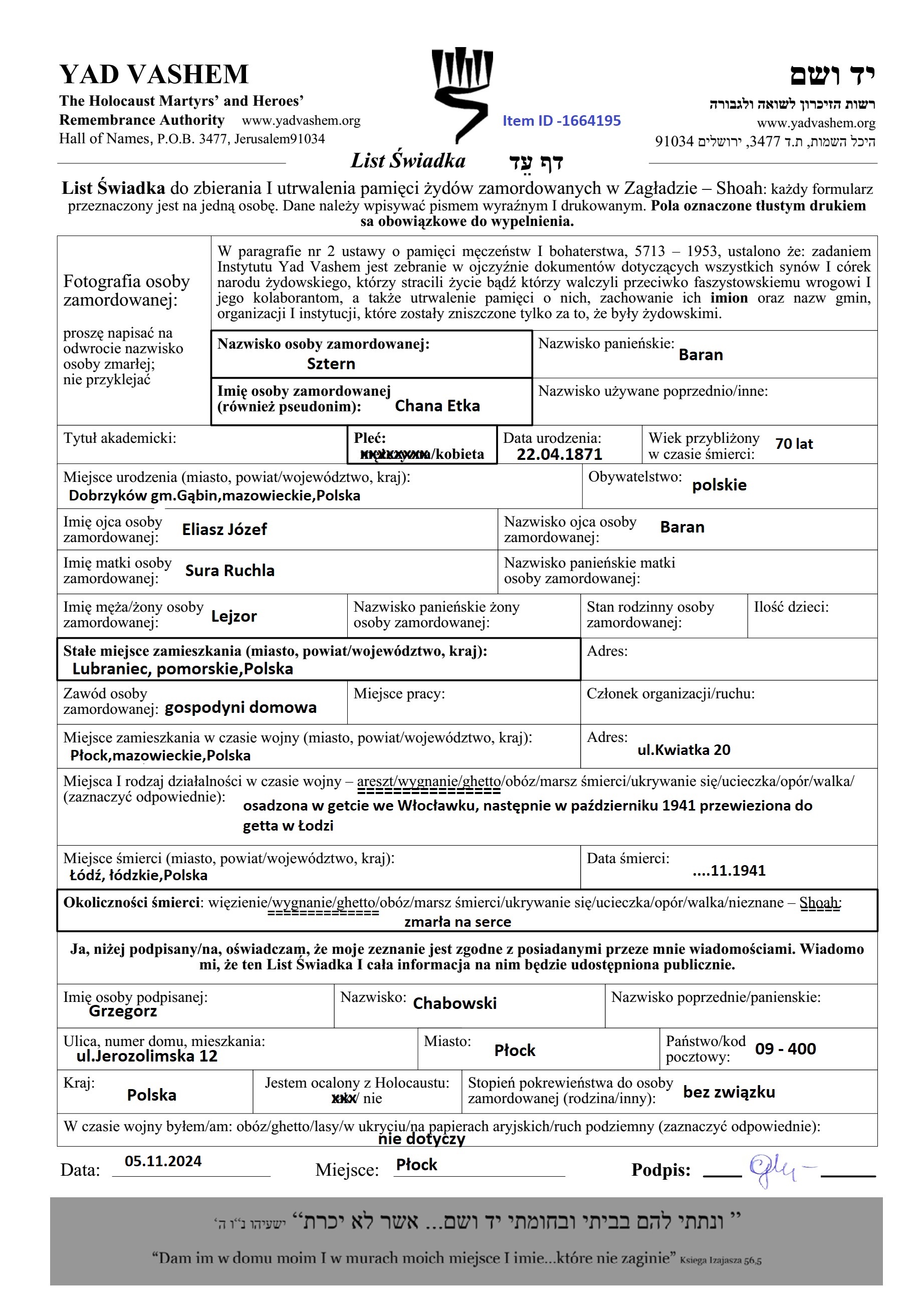Штерн | Хана Этка | 1871 | Любранец, Польша | Лист свидетельских показаний |