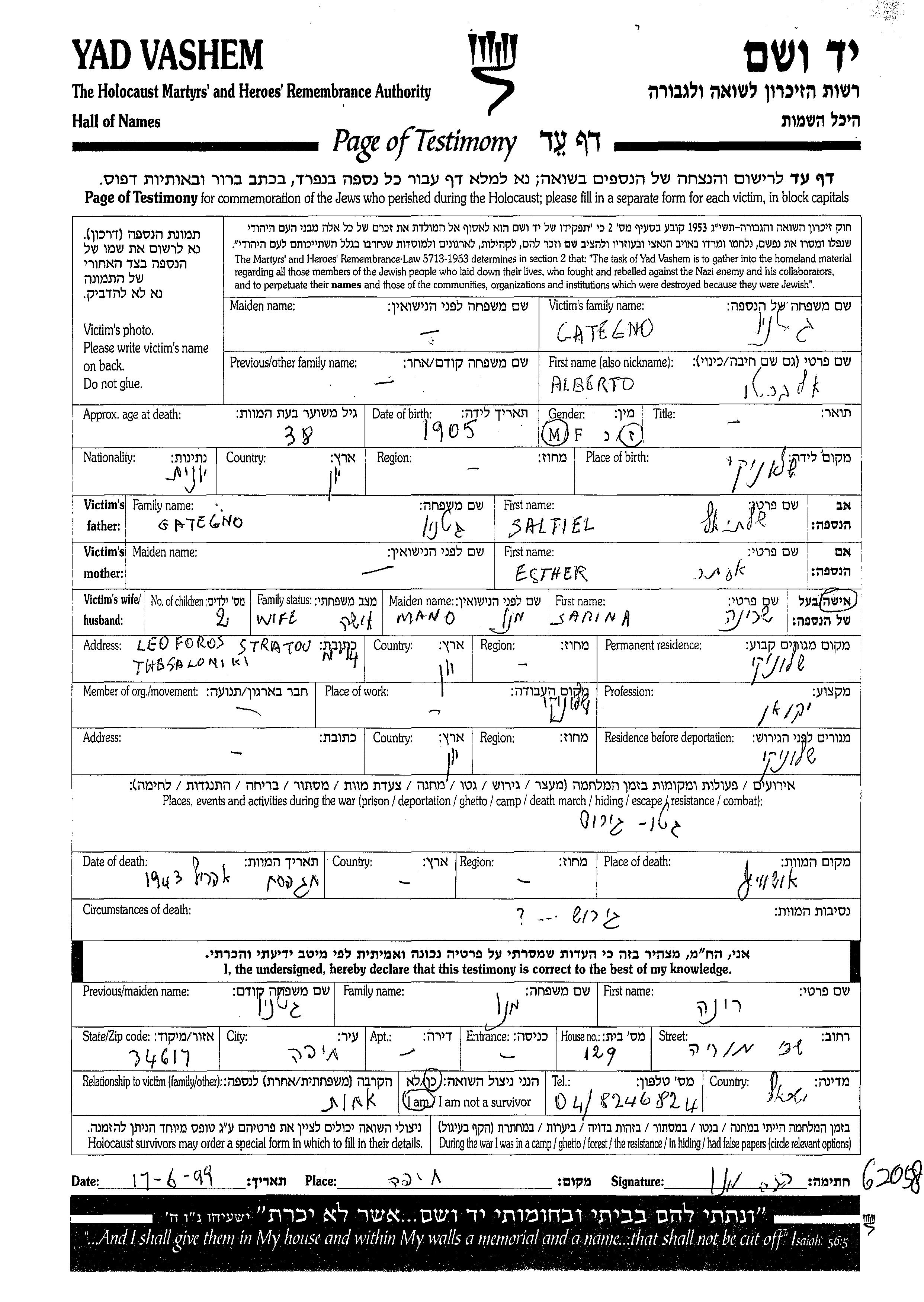 Гатеньо Альберто 1903 Салоники, Греция Лист свидетельских показаний