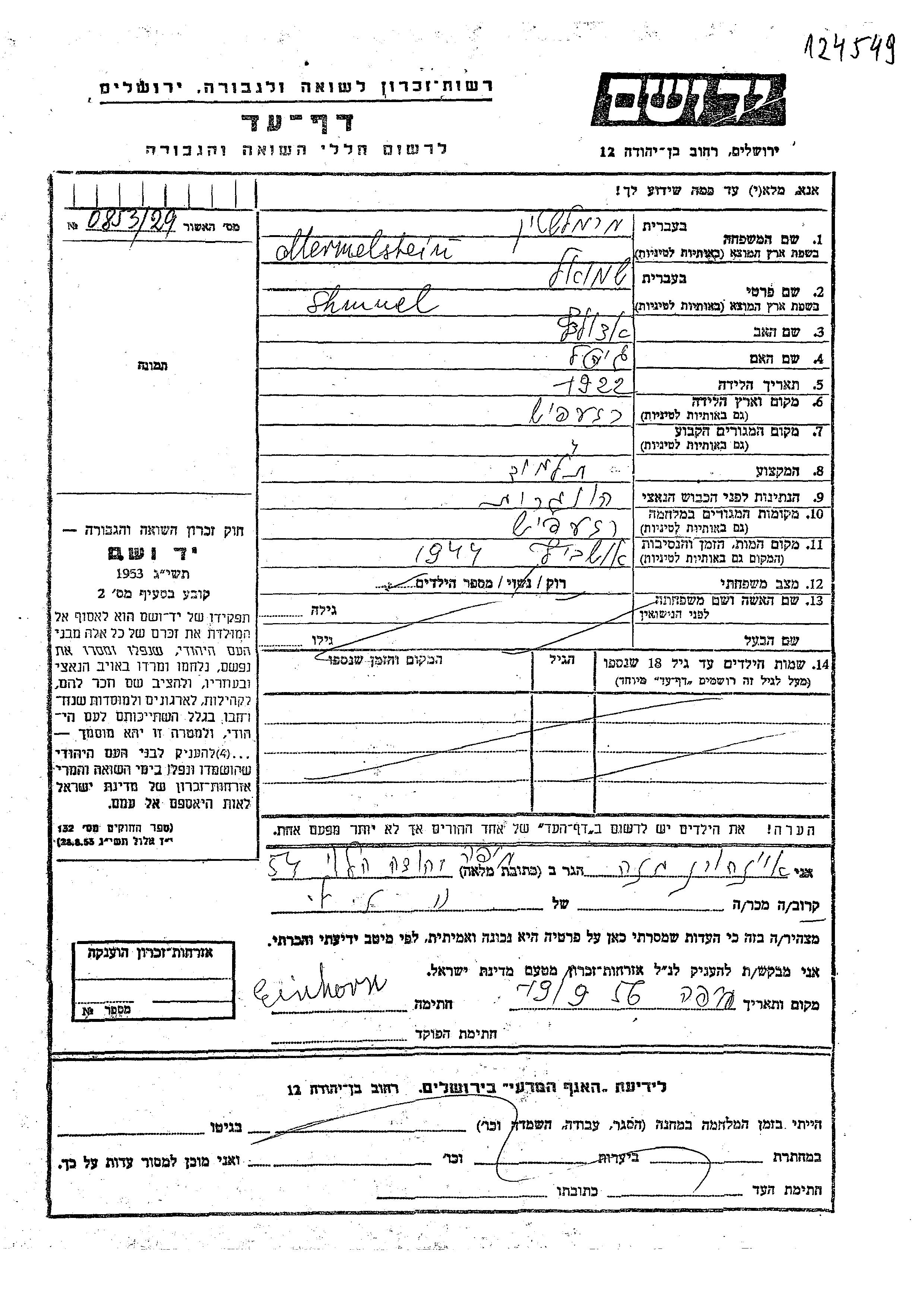 Мермельштейн Шмуэль 1922 Rzepisz, Румыния Лист свидетельских показаний