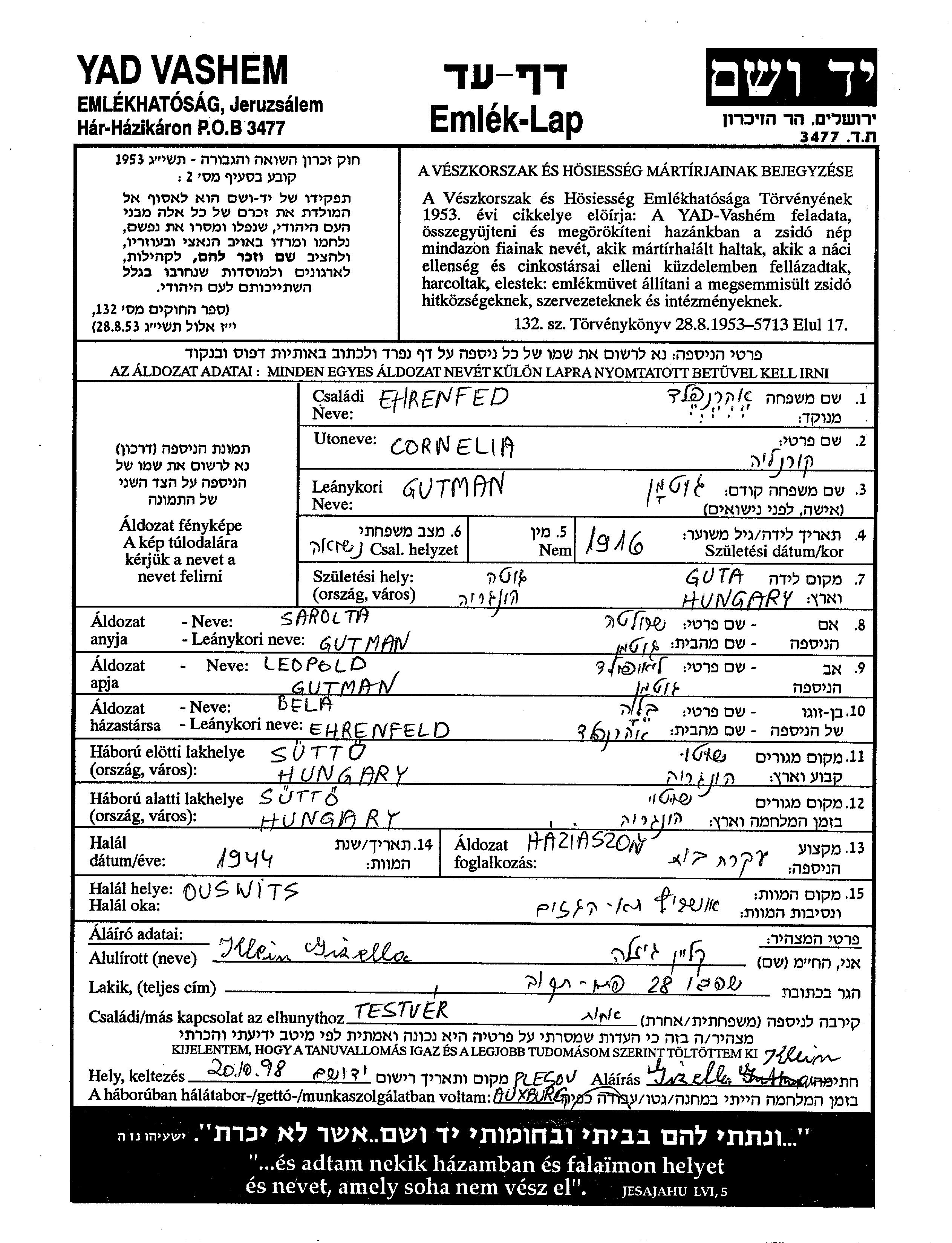 Корнелия Эренфельд, девичья фамилия Гутман, место рождения: Гута, Венгрия. Отец: Лиопольд, mать:Шарольта. Домохозяйка. Женат / замужем. Место жительства до войны: Шюттё, Венгрия. Место во время войны: Шюттё, Венгрия.