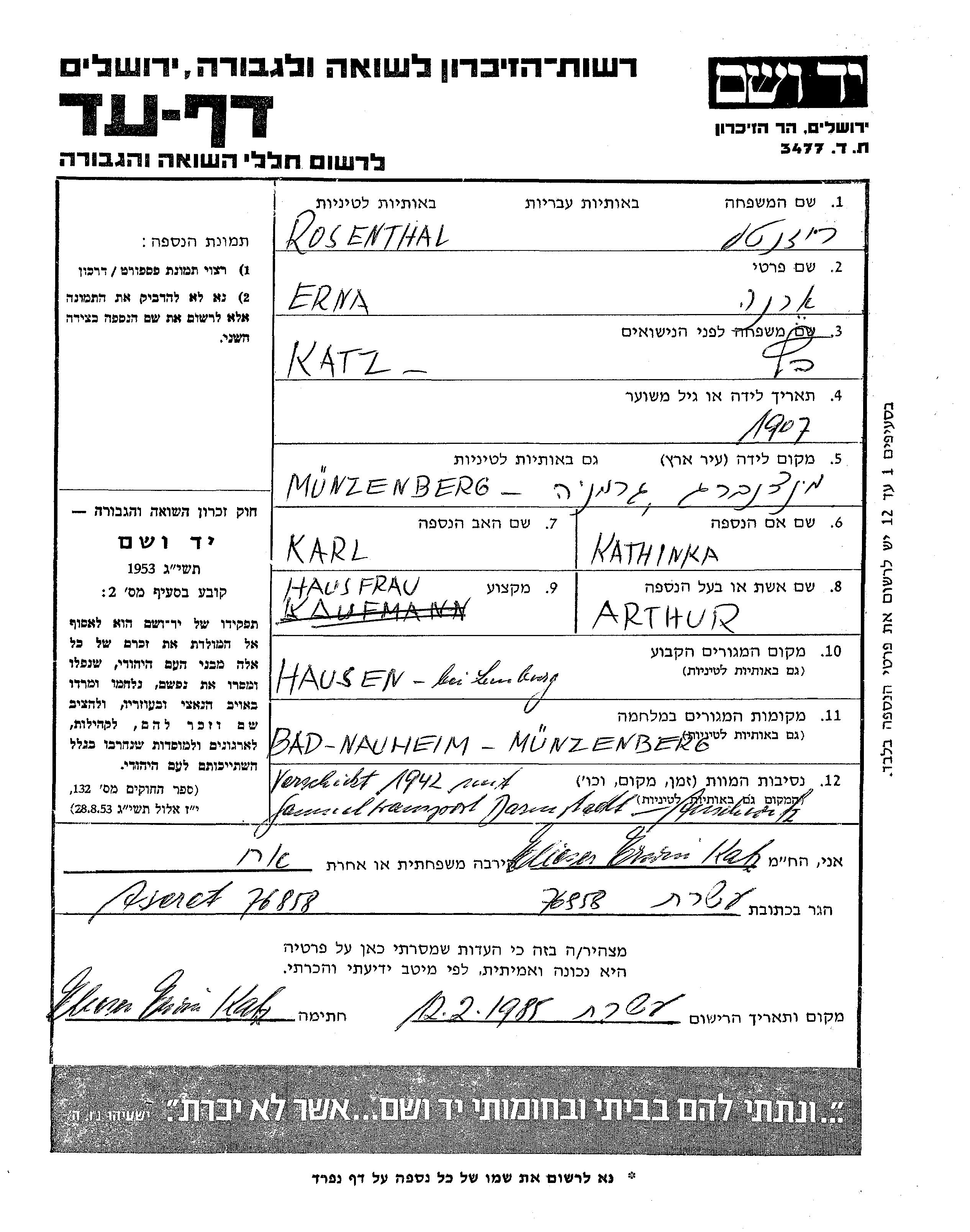 Эрна Розенталь, девичья фамилия Кац, место рождения: Мюнценберг, Германия. Отец: Карл, mать:Катинка. Домохозяйка. Женат / замужем. Место жительства до войны: Хаузен, Германия. Место во время войны: Бад-Наухейм, Германия.