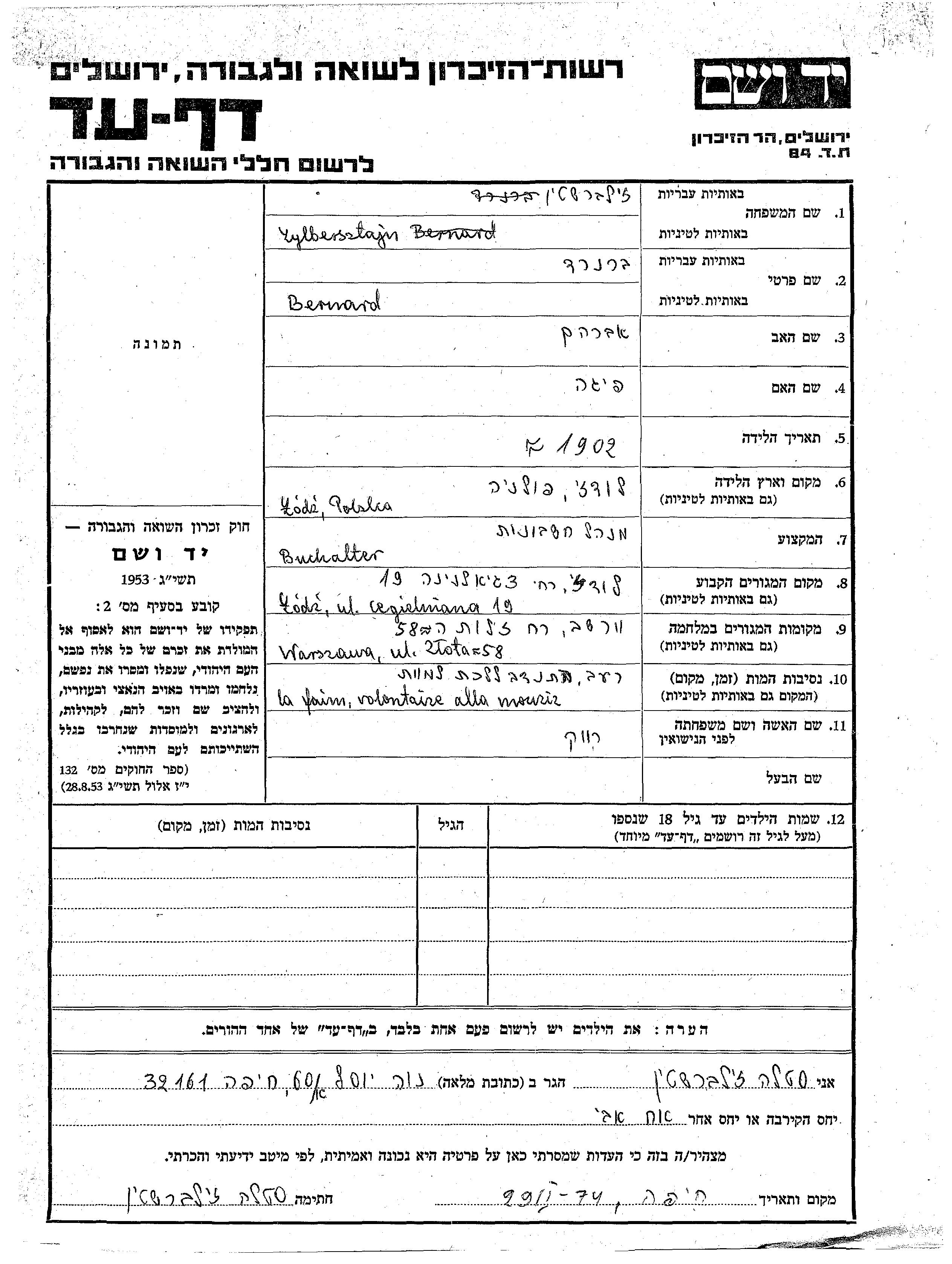 Бернард Зильберштайн, место рождения: Лодзь, Польша. Отец: Авраам, mать:Фейга. Бухгалтер / счетовод. Холост / не замужем. Место жительства до войны: Лодзь, Польша. Место во время войны: Варшава, Польша.
