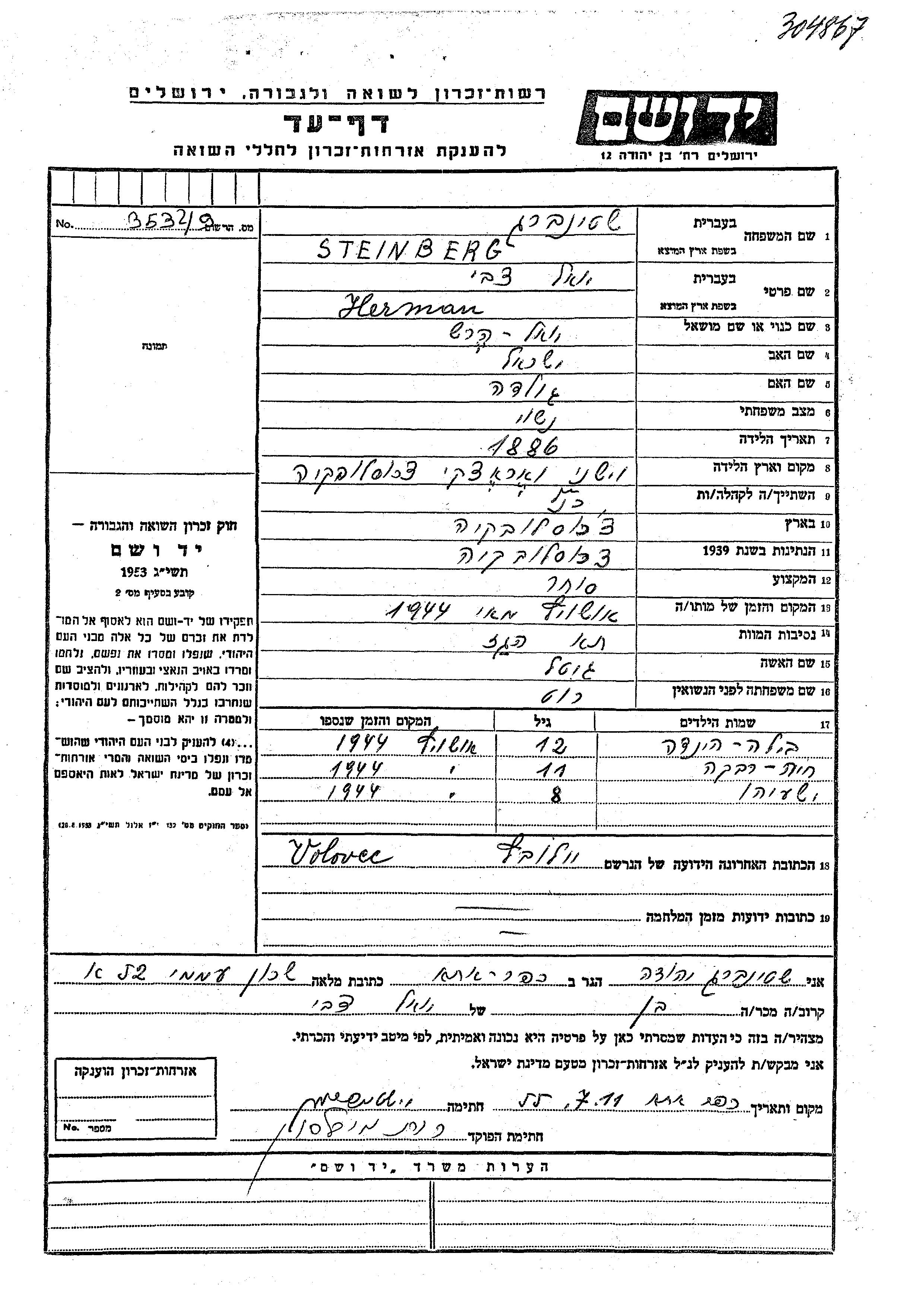 Херман Йоэль Цви Штайнберг, место рождения: Вишни Верецки, Чехословакия. Отец: Исраэль, mать:Голда. Торговец / торговка. Женат / замужем. Место жительства до войны: Вишни Верецки, Чехословакия. Место во время войны: Воловец, Чехословакия.