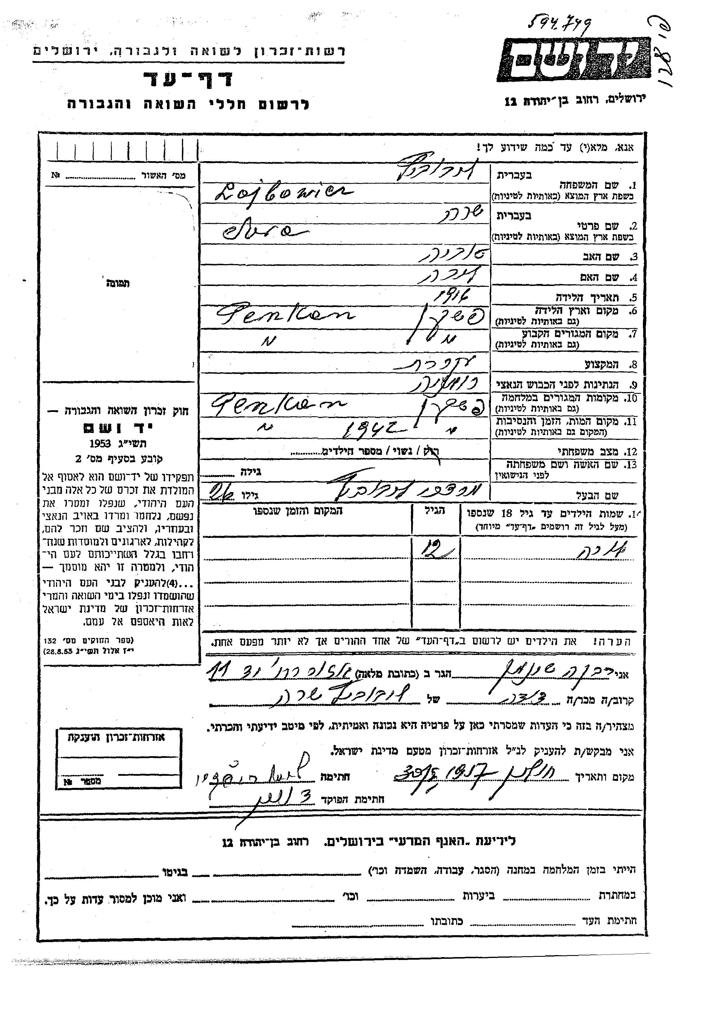 Лойбовиц Сара 1916 Пашкань, Румыния Лист свидетельских показаний