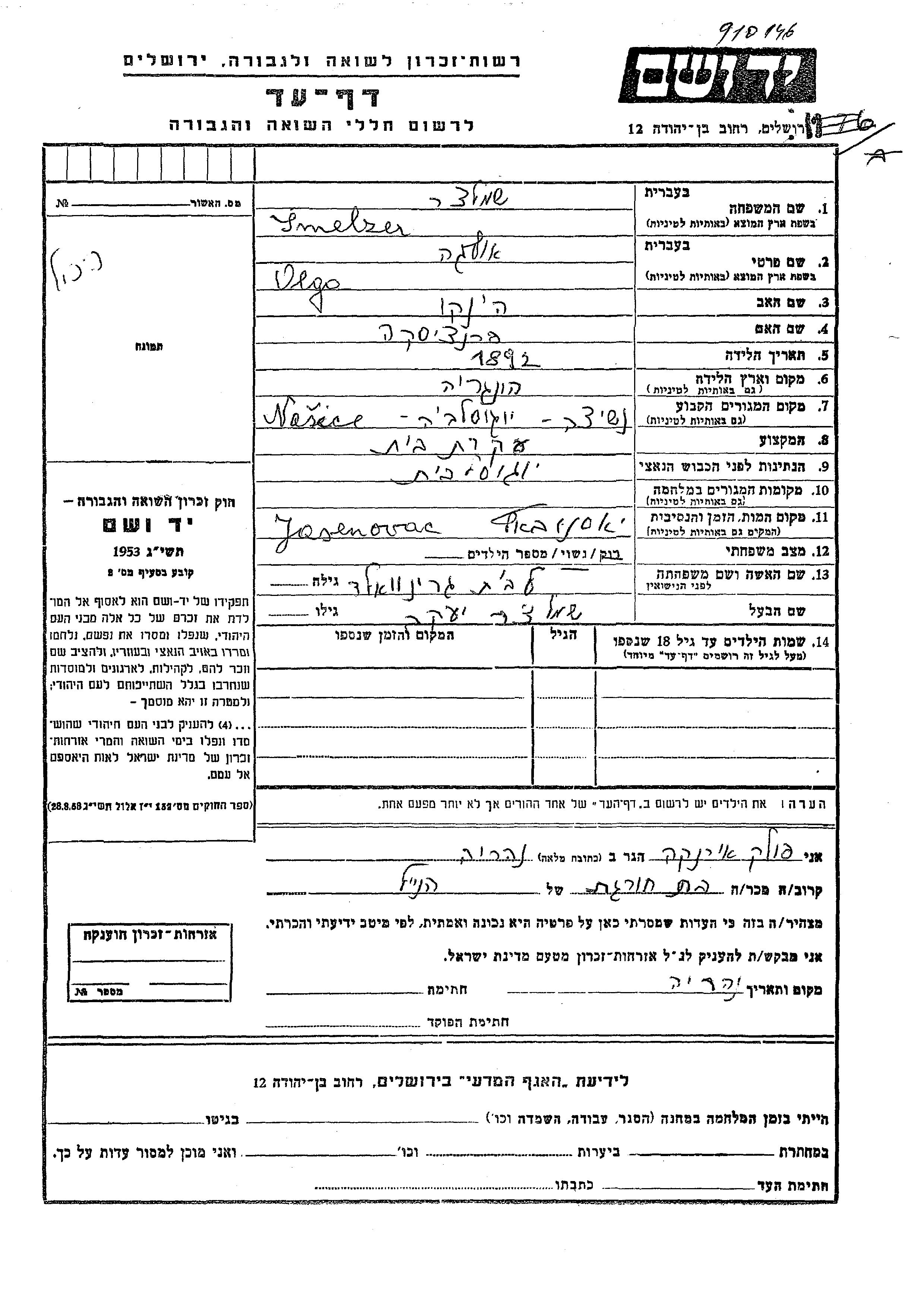 Шмельцер Ольга 1892 Нашице, Югославия Лист свидетельских показаний