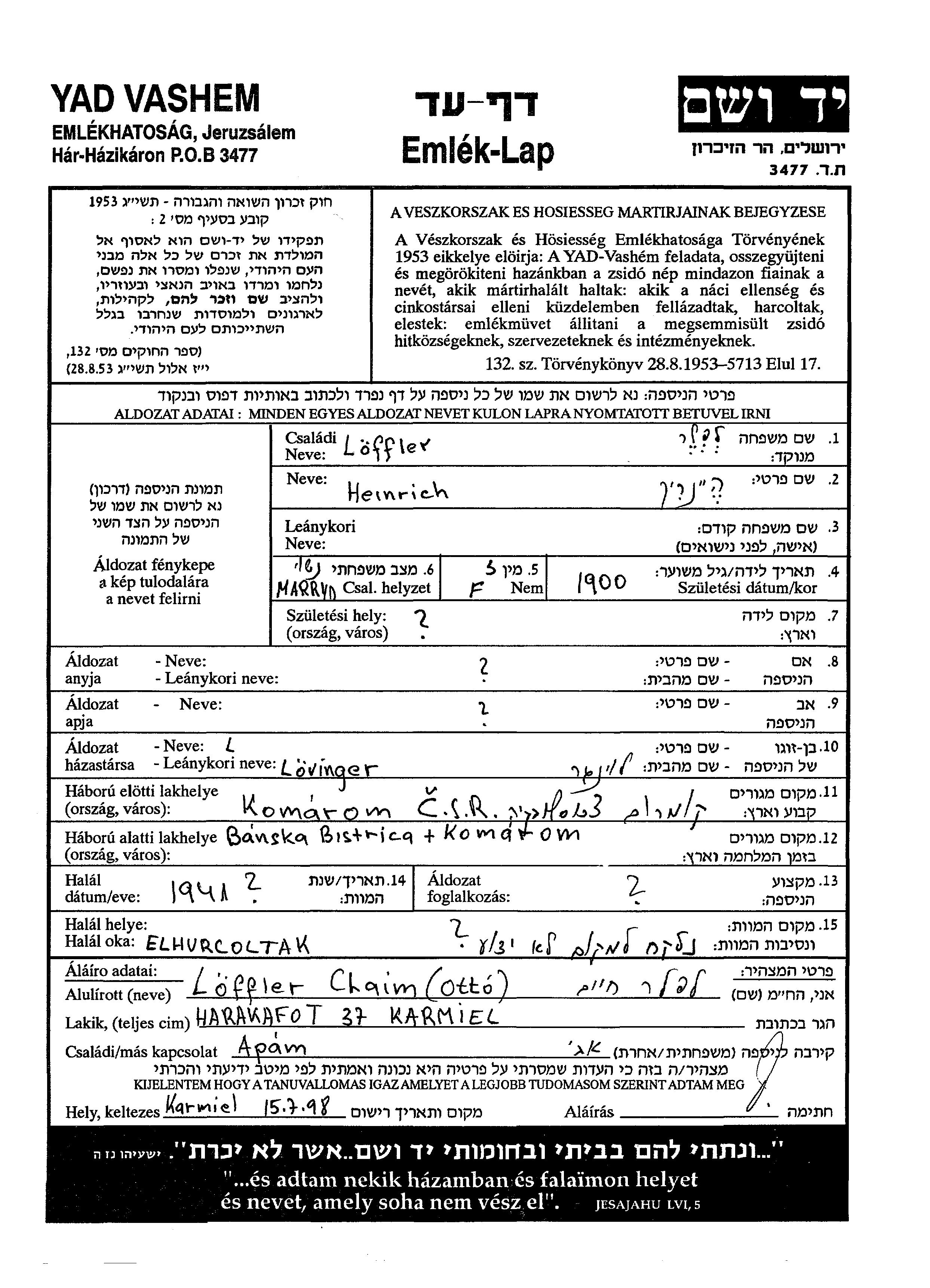 Хайнрих Лоффлер. Женат / замужем. Место во время войны: Комаром, Чехословакия.