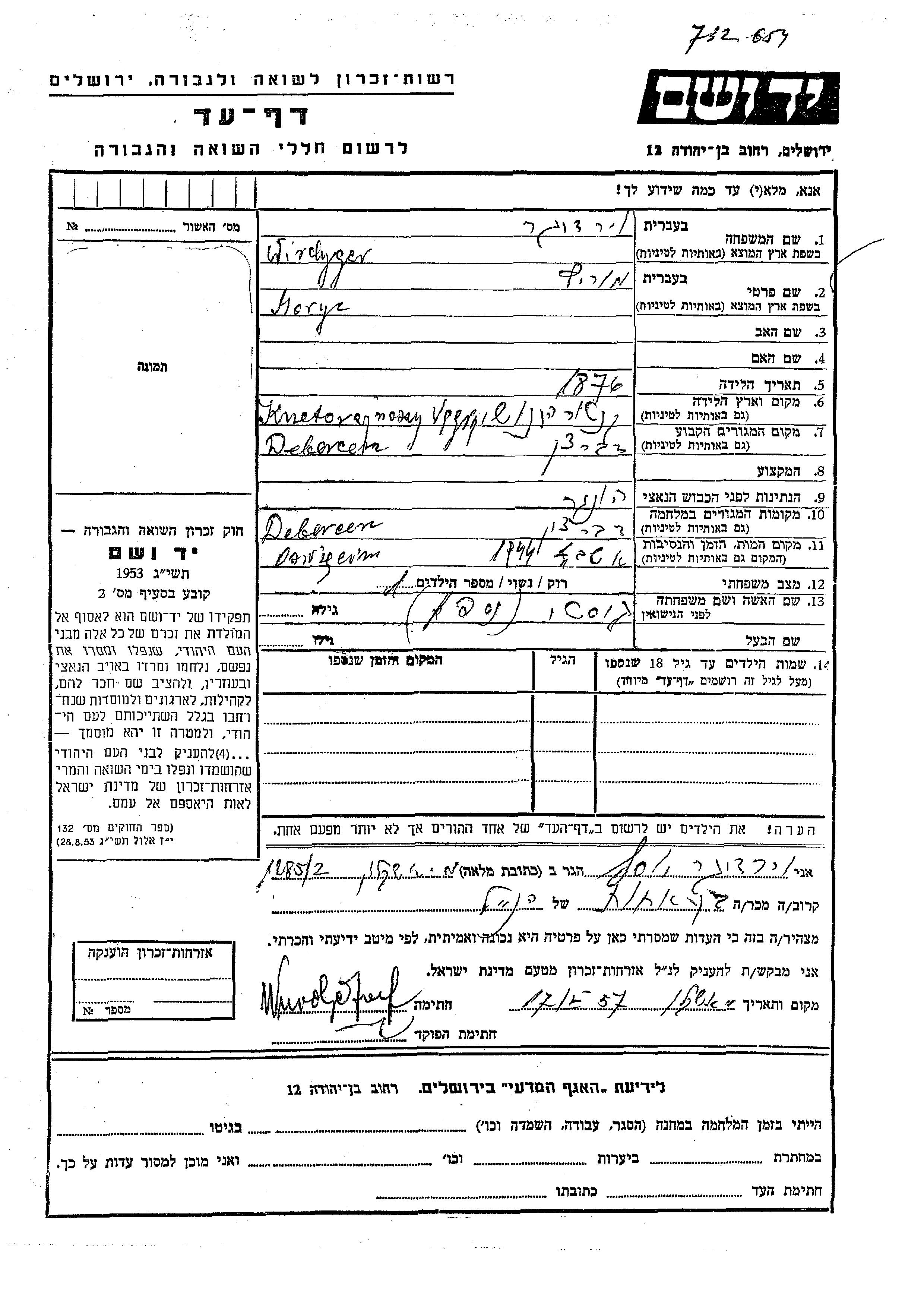 Мориц Вирдигер, место рождения: Канторьяноши, Венгрия. Женат / замужем. Место жительства до войны: Дебрецин, Венгрия. Место во время войны: Дебрецин, Венгрия.