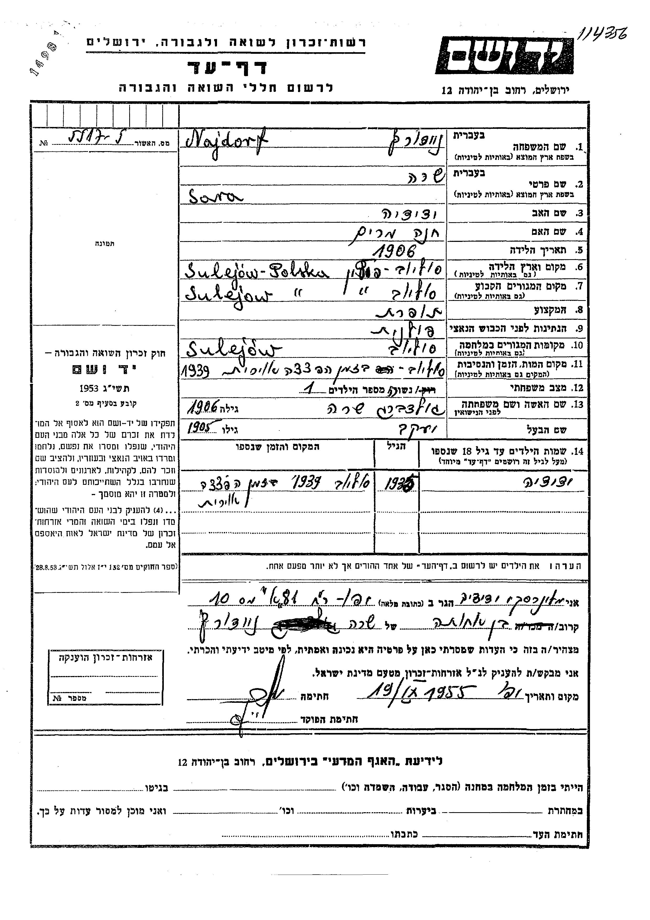 Сара Найдорф, девичья фамилия Гольдберг, место рождения: Сулеёв, Польша. Отец: Едидия, mать:Хана Мирьям. Швея. Женат / замужем. Место жительства до войны: Сулеёв, Польша. Место во время войны: Сулеёв, Польша.